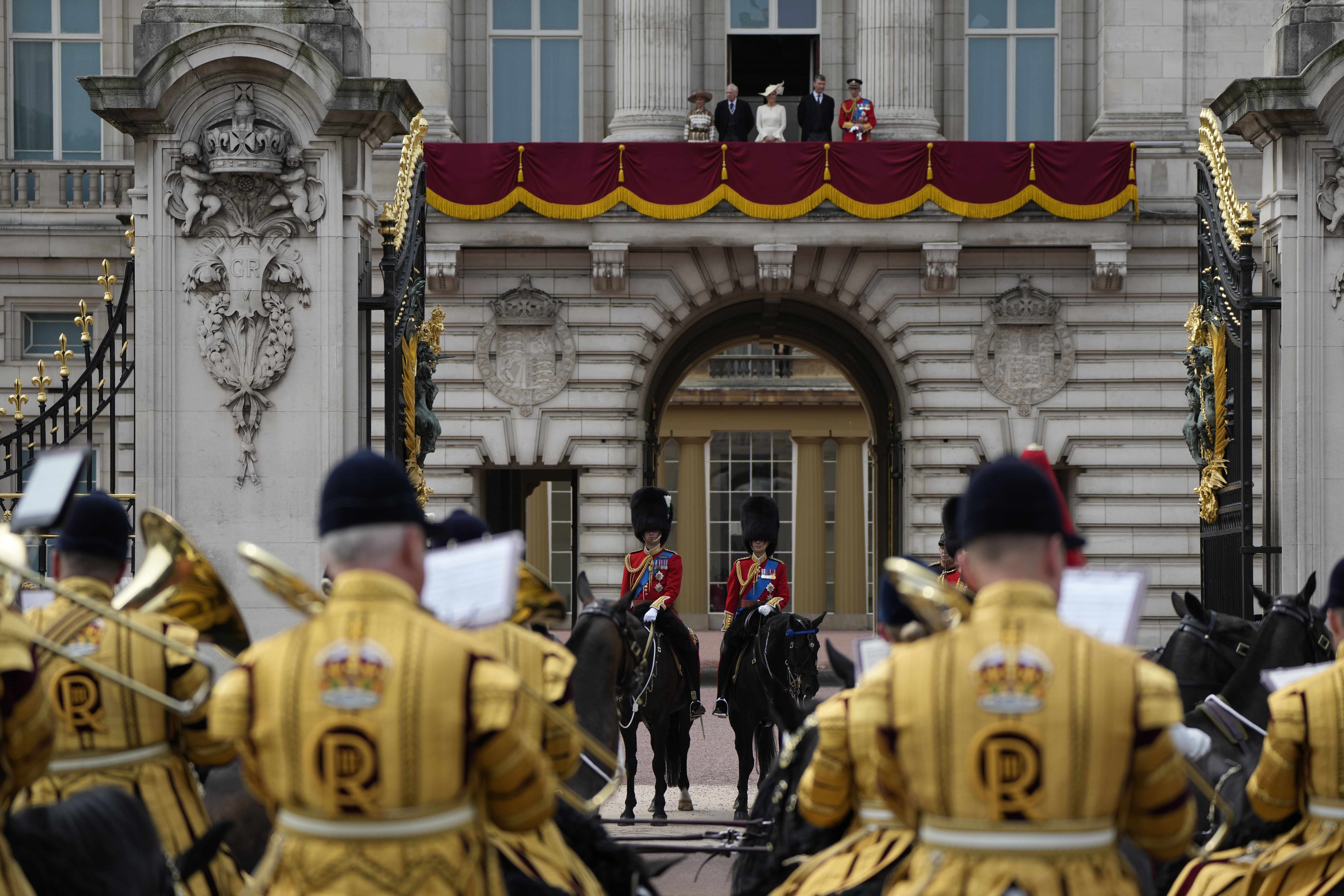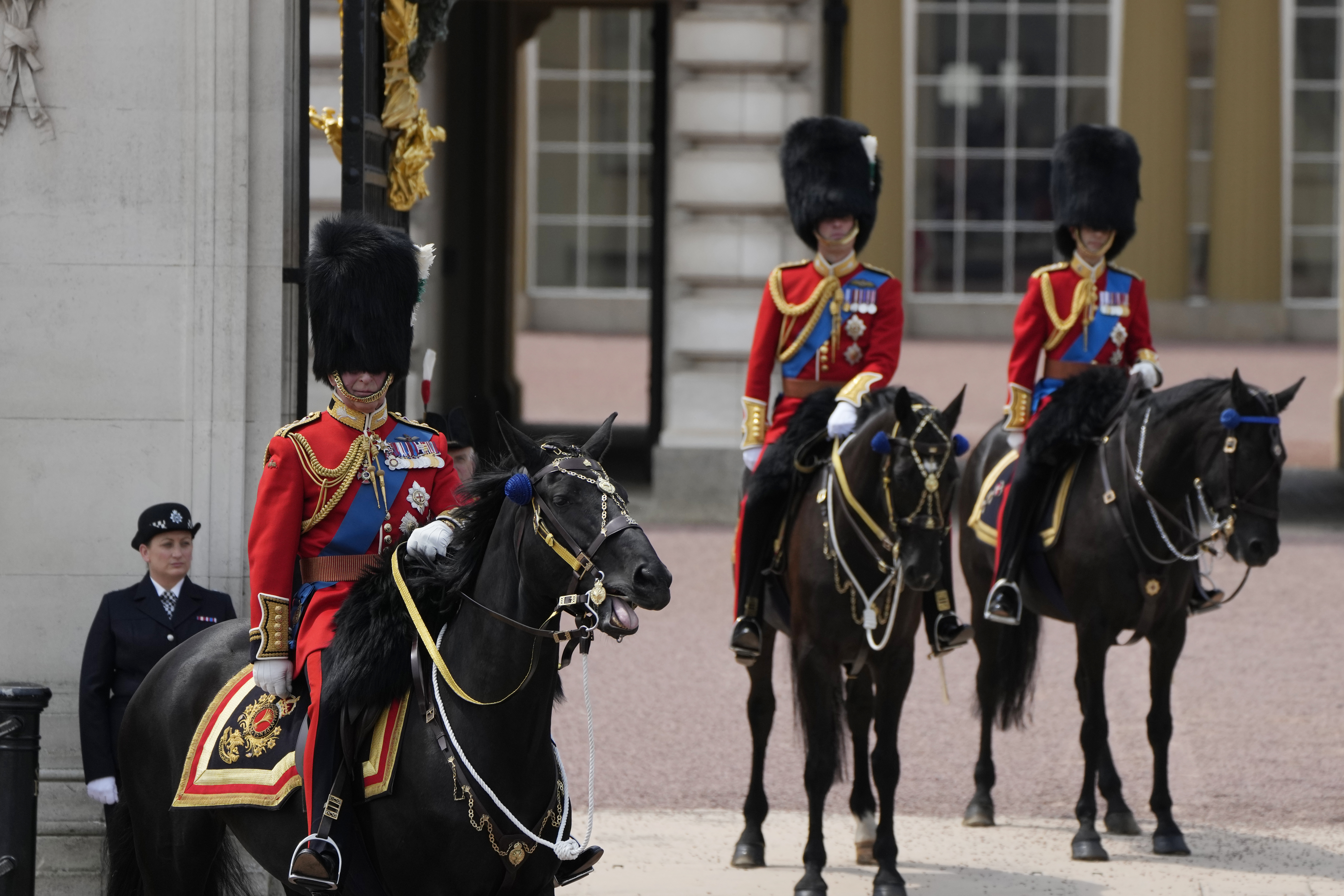Ακολουθεί η παραδοσιακή επιθεώρηση του στρατεύματος κοντά στα Ανάκτορα του Μπάκιγχαμ.