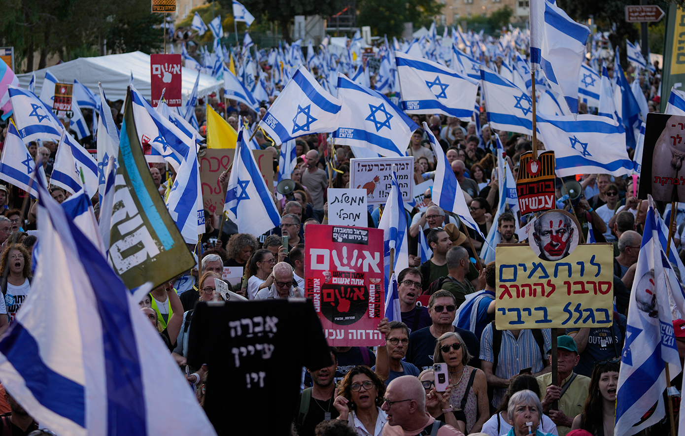 Λίγο πριν από τη δύση του ηλίου, χιλιάδες διαδηλωτές που είχαν συγκεντρωθεί έξω από το ισραηλινό κοινοβούλιο (Κνεσέτ) σχεδίαζαν να ξεκινήσουν πορεία προς την κατοικία του πρωθυπουργού Νετανιάχου. Πολλοί ανέμιζαν ισραηλινές σημαίες, άλλοι κρατούσαν πλακάτ που επέκριναν τους χειρισμούς Νετανιάχου σε διάφορα ζητήματα – από τον πόλεμο εναντίον της Χαμάς στη Γάζα και της Χεζμπολάχ στον Λίβανο, μέχρι το αμφιλεγόμενο νομοσχέδιο που εξαιρεί τους υπερορθόδοξους εβραίους από την υποχρεωτική στρατιωτική θητεία.