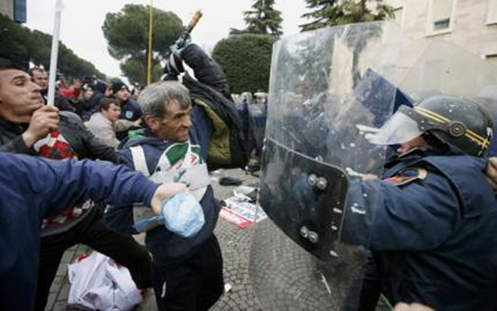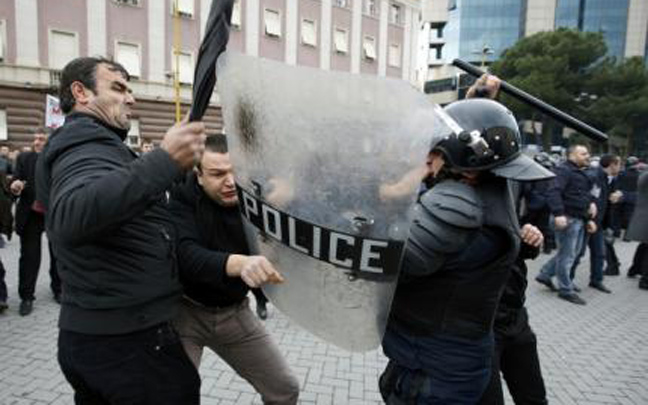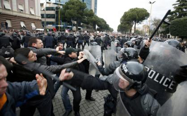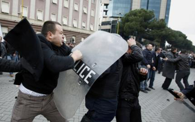 Συμπλοκές μεταξύ διαδηλωτών και αστυνομικών, καθώς και πυρπολημένα αυτοκίνητα δίνουν την εικόνα των όσων διαδραματίστηκαν, λίγο νωρίτερα, μπροστά από το κυβερνητικό μέγαρο, στα Τίρανα, στη διαδήλωση της αντιπολίτευσης κατά της κυβέρνησης.