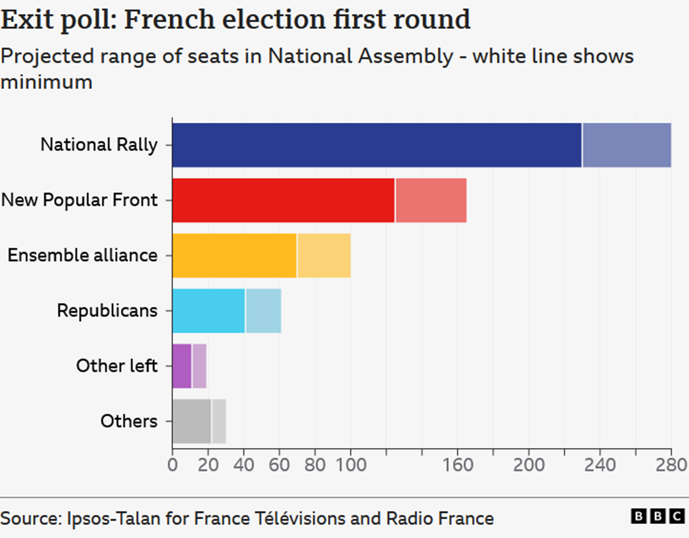 Το ακροδεξιό γαλλικό κόμμα Εθνικός Συναγερμός (RN) και οι σύμμαχοί του έλαβαν το 33% των ψήφων στον πρώτο γύρο των βουλευτικών εκλογών, ανακοίνωσε το υπουργείο Εσωτερικών, ενώ το αριστερό Νέο Λαϊκό Μέτωπο ήρθε δεύτερο με 28%. Ο κεντρώος συνασπισμός του προέδρου Εμανουέλ Μακρόν έλαβε το 20% των ψήφων, σύμφωνα με την ανακοίνωση του υπουργείου.
