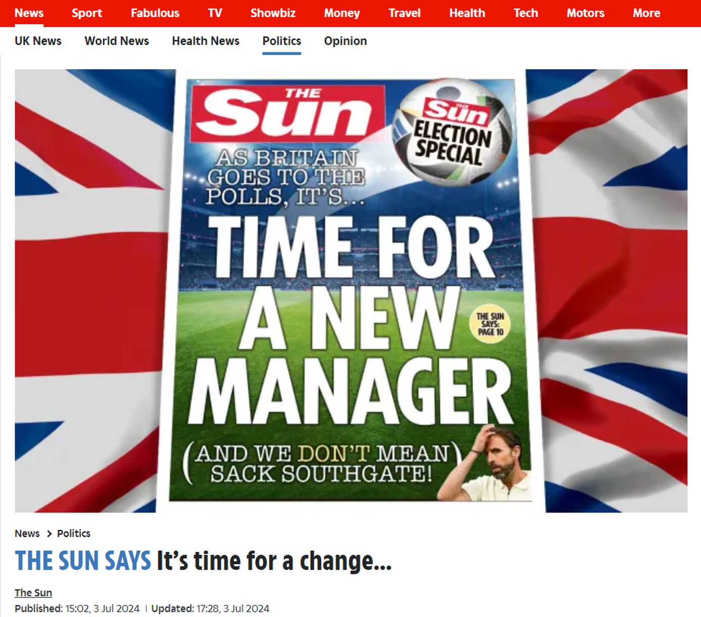 Σήμερα εξάλλου, για πρώτη φορά από το 2005 και μετά, η δημοφιλής εφημερίδα Sun με πρωτοσέλιδο τίτλο «Είναι ώρα για αλλαγή» στηρίζει τους Εργατικούς. Είχαν προηγηθεί οι εφημερίδες Sunday Times και Financial Times.