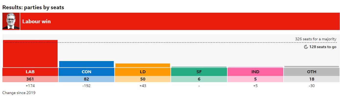 Το εκλογικό αποτέλεσμα εκτιμάται ότι θα δώσει στους Εργατικούς μία πλειοψηφία 170 εδρών, κατεβάζοντας την αυλαία των συντηρητικών κυβερνήσεων, οι οποίες για 14 χρόνια κυβέρνησαν τη Βρετανία.