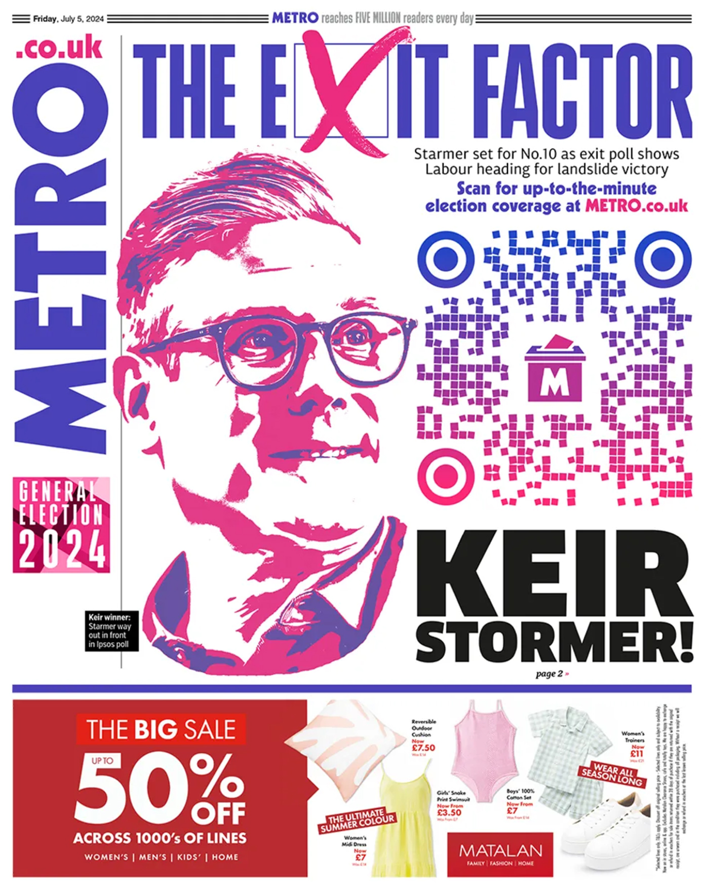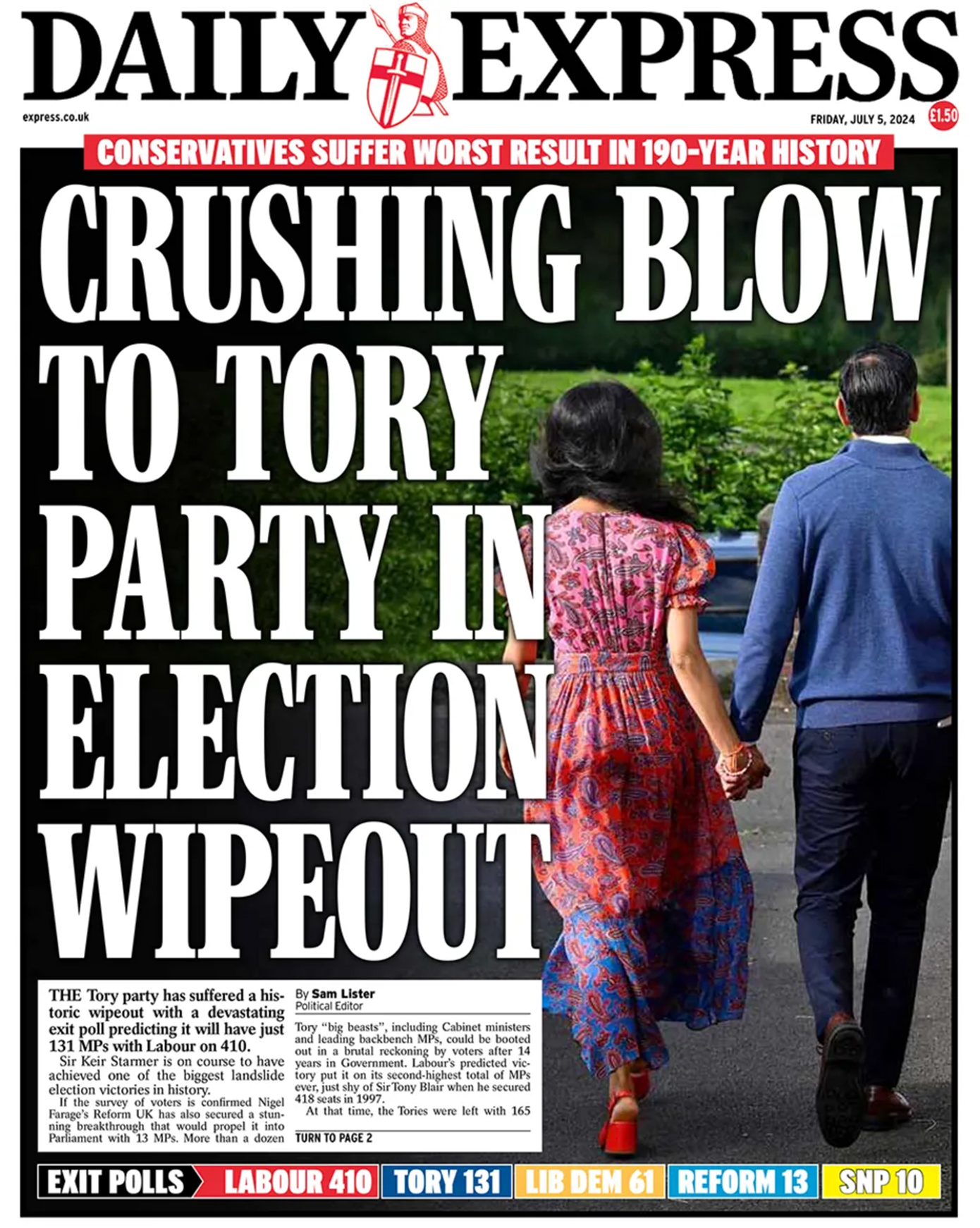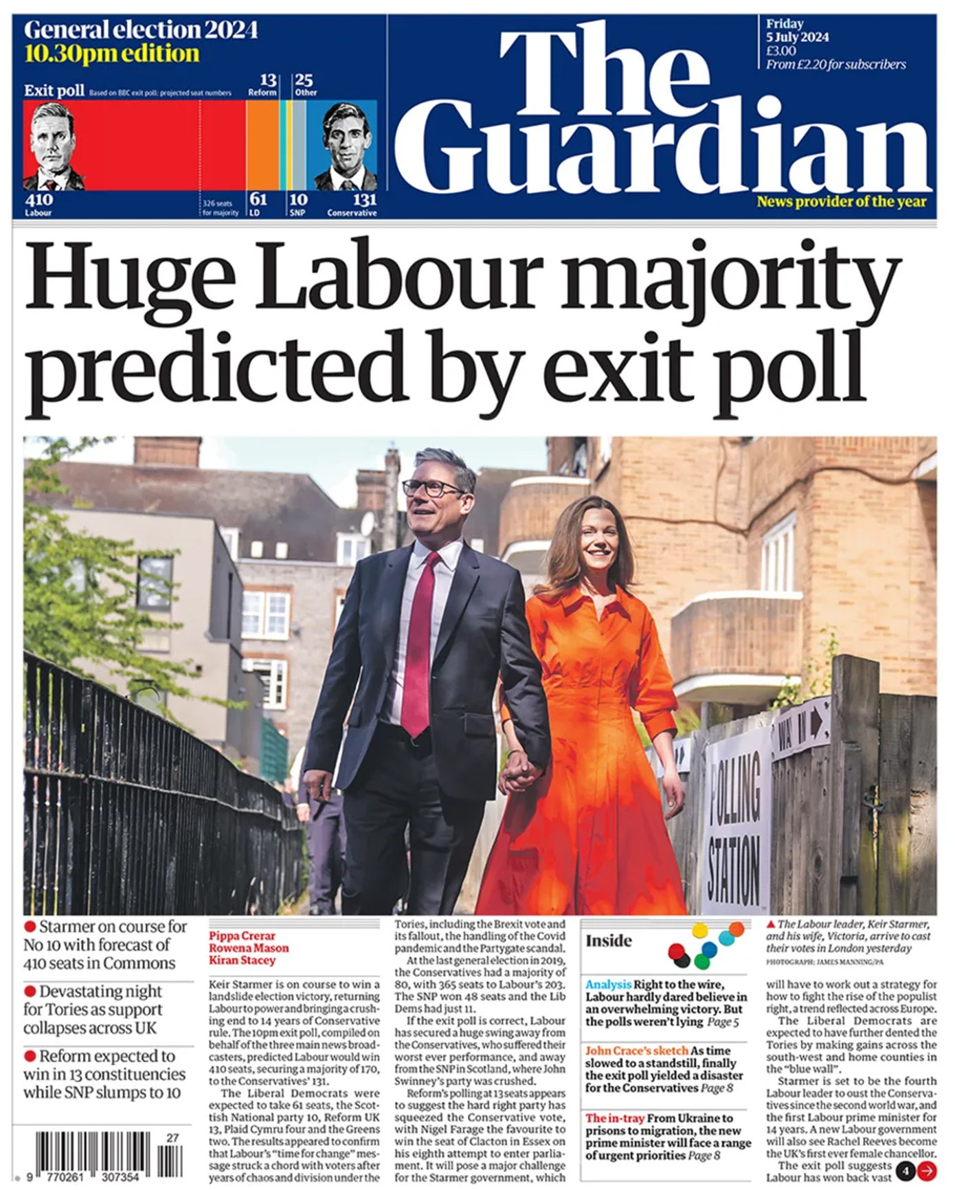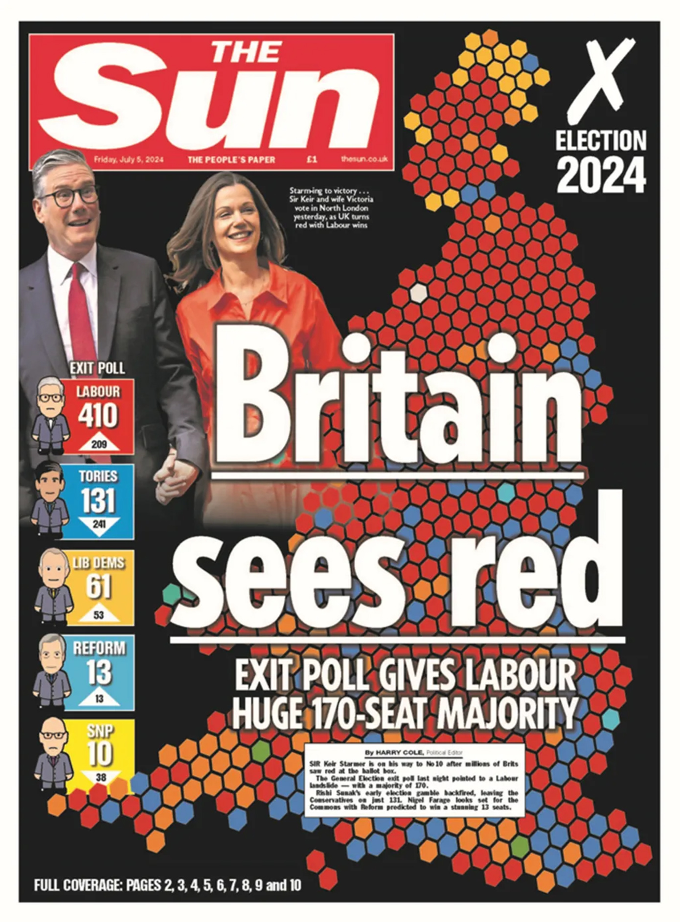 Η Sun γράφει στο πρωτοσέλιδό της πως «Η Βρετανία έγινε κόκκινη», από το χρώμα των Εργατικών. Η Daily Express που κάνει λόγο για συντριπτικό χτύπημα στους Συντηρητικούς. Τεράστια πλειοψηφία δείχνουν τα exit poll για τους Εργατικούς γράφει ο Guardian.