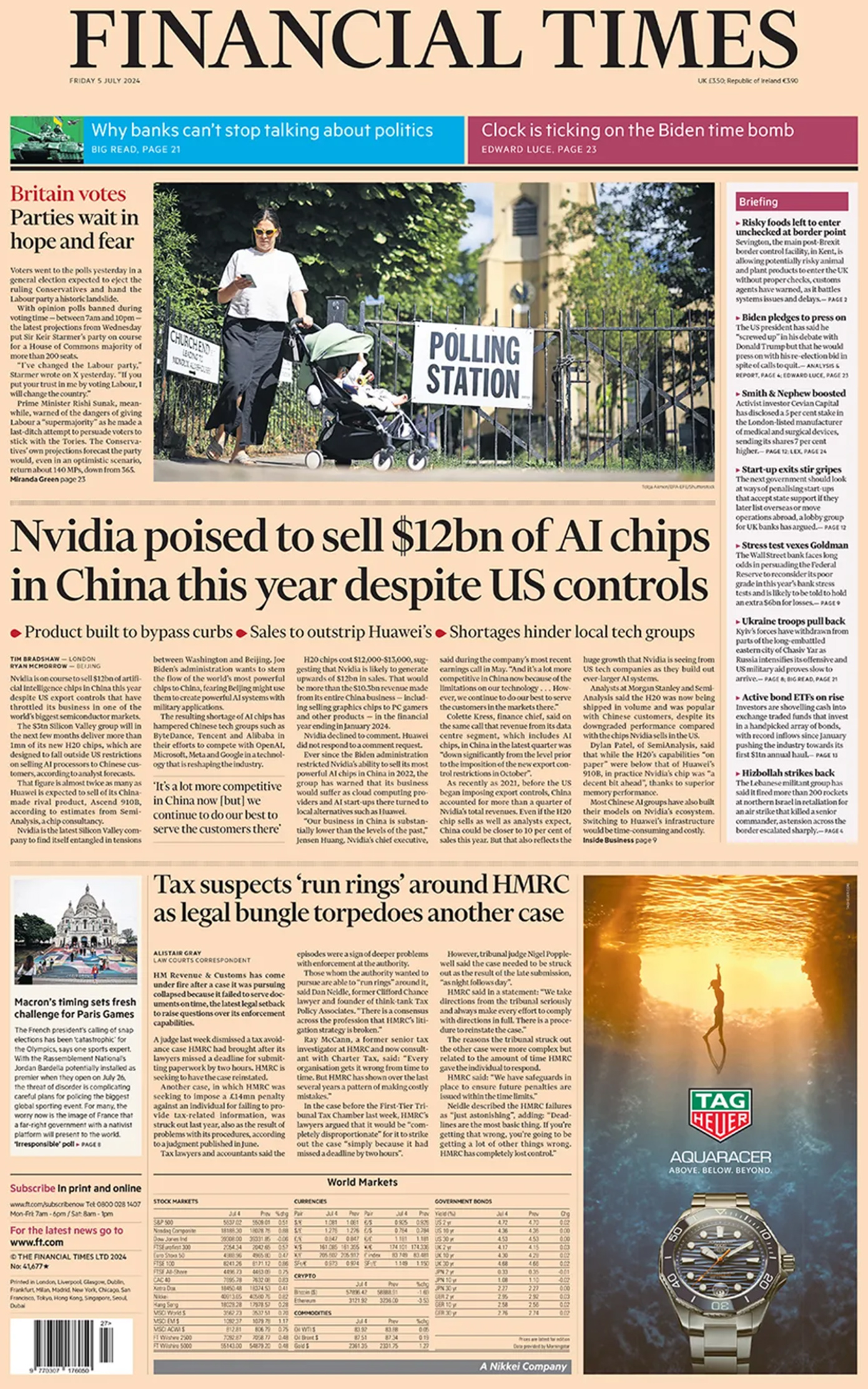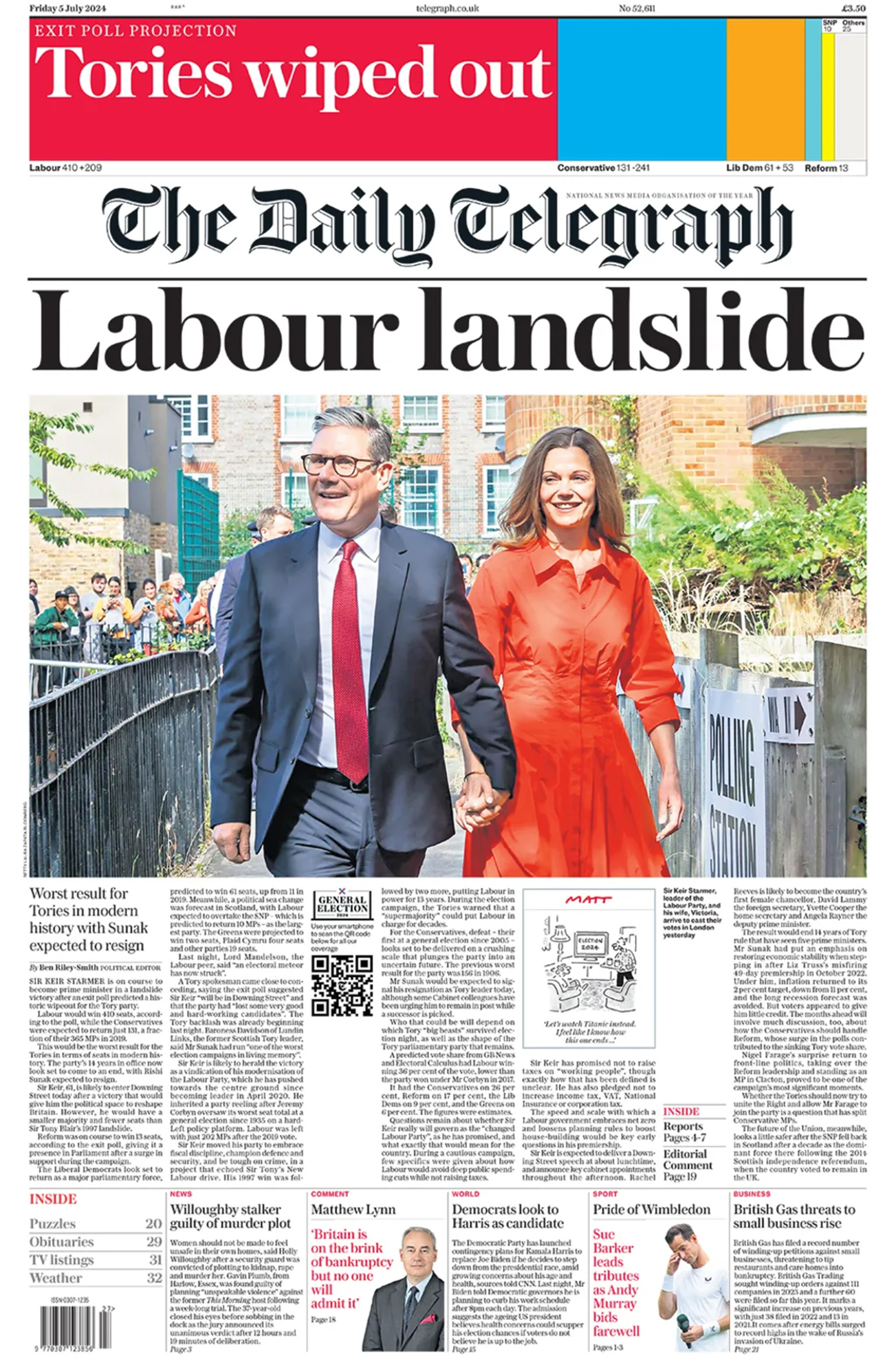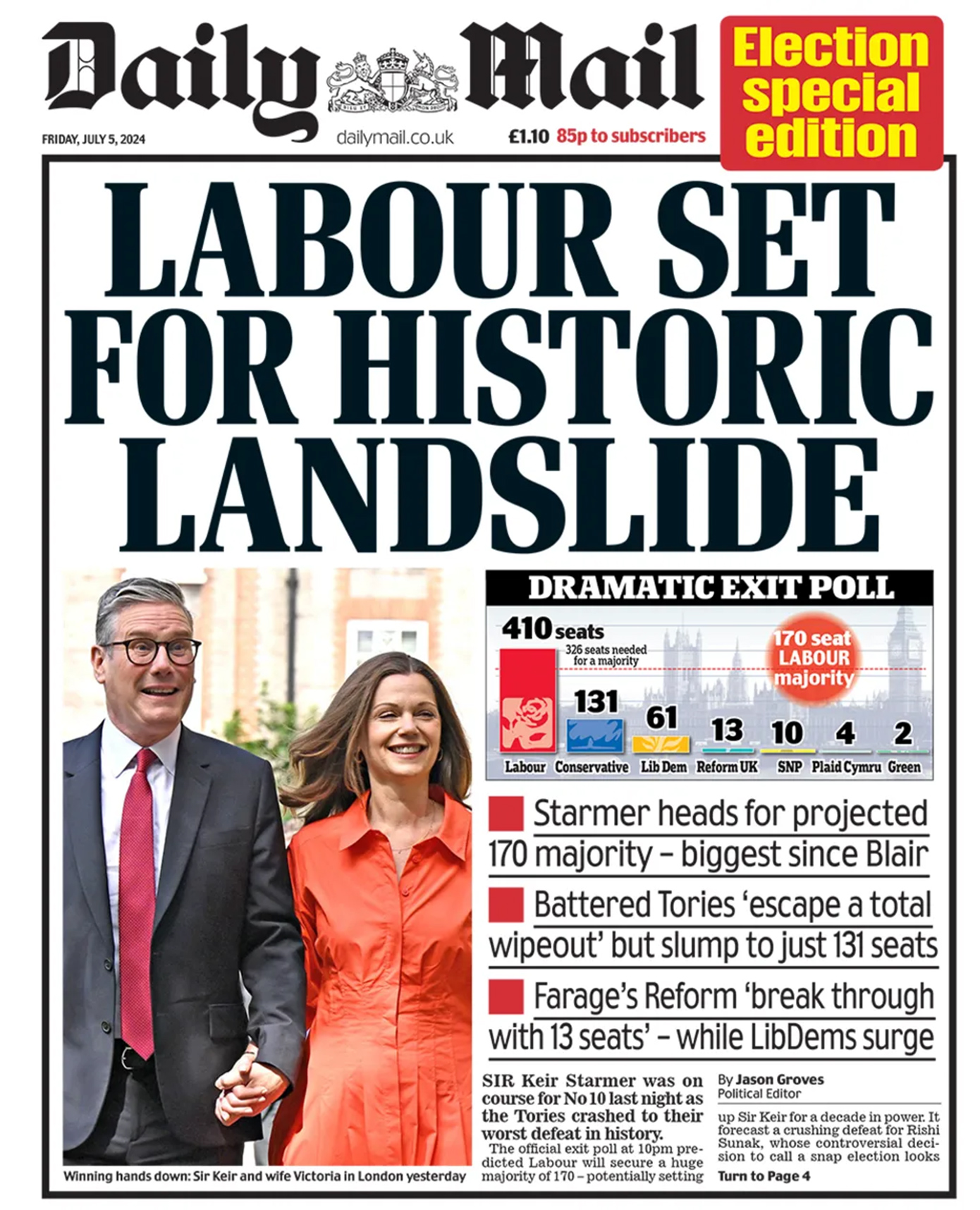 Οι Εργατικοί είναι έτοιμοι για μια ιστορική σαρωτική νίκη σχολιάζει η Daily Mail. Από την πλευρά τους, οι Times υπενθυμίζουν ότι η νίκη του Στάρμερ θυμίζει την πλειοψηφία του Μπλερ στις εκλογές του 1997.