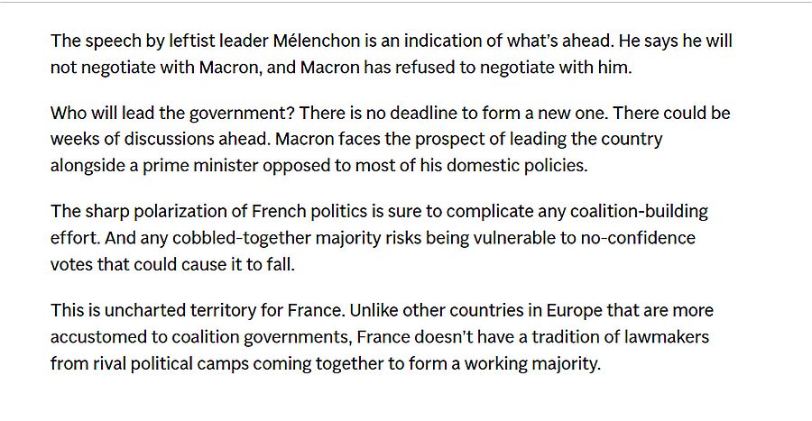 Και καταλήγει: «Αυτό είναι ένα αχαρτογράφητο έδαφος για τη Γαλλία. Σε αντίθεση με άλλες χώρες της Ευρώπης που είναι πιο συνηθισμένες σε κυβερνήσεις συνασπισμού, η Γαλλία δεν έχει παράδοση στο να συναντώνται νομοθέτες από αντίπαλα πολιτικά στρατόπεδα για να σχηματίσουν μια λειτουργική πλειοψηφία».