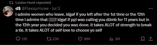 «Θαυμάζω τις γυναίκες που φεύγουν είτε την πρώτη είτε τη 12η φορά, αφότου κακοποιήθηκαν. Χρειάζεται ΠΟΛΛΗ δύναμη, για να σπάσεις τον φαύλο κύκλο. Χρειάζεται να αγαπάς πολύ τον εαυτό σου, για να τον διαλέξεις», έγραφε το tweet, που αναδημοσίευσε η Λουίζ Χαντ.