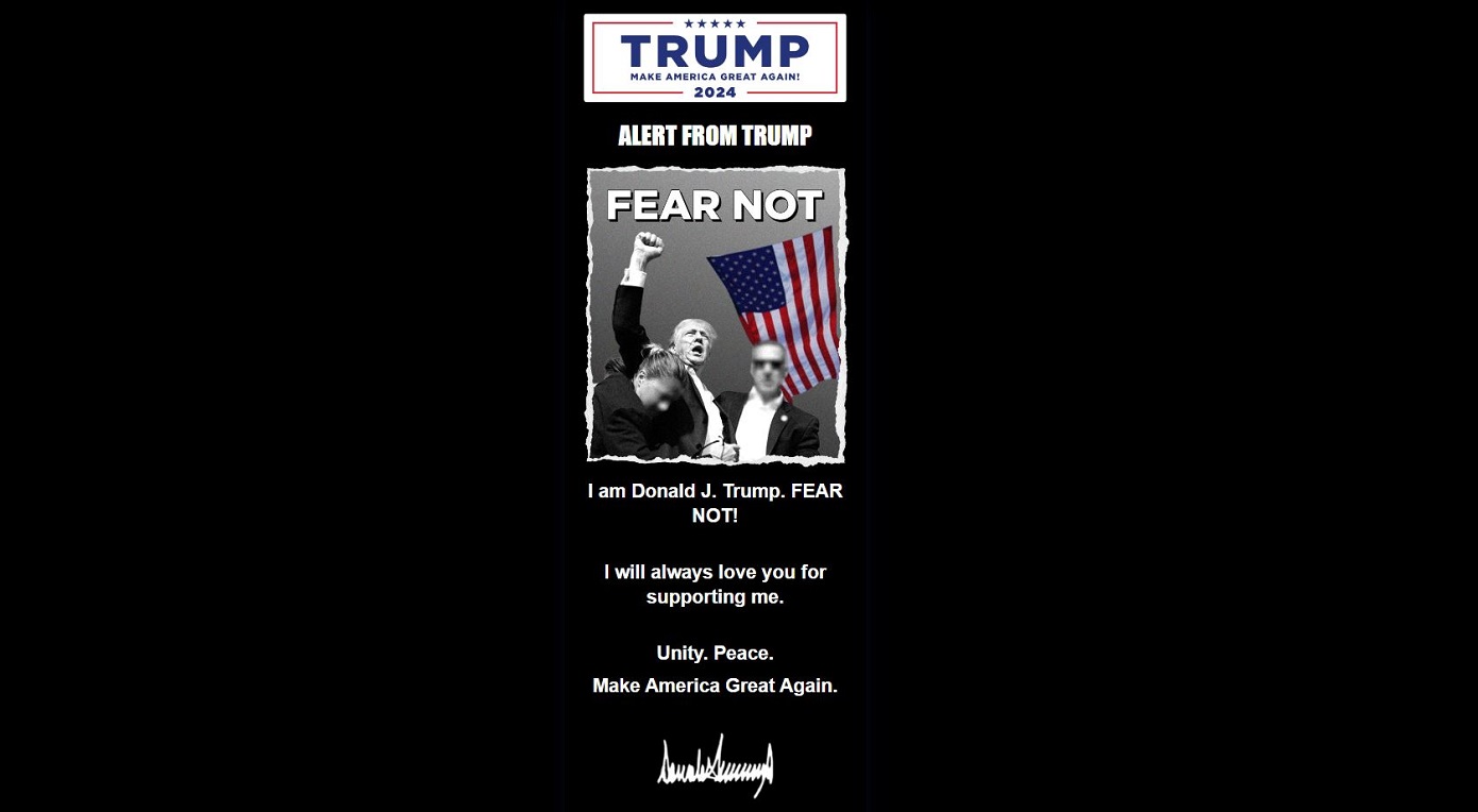 Ένα μήνυμα κάτω από την εικόνα λέει: «Ενότητα. Ειρήνη. Κάντε την Αμερική Μεγάλη Ξανά». Η σελίδα φέρει επίσης την υπογραφή του Τραμπ και δίνει στους επισκέπτες του ιστοτόπου επιλογές να κάνουν δωρεά διαφόρων ποσών.