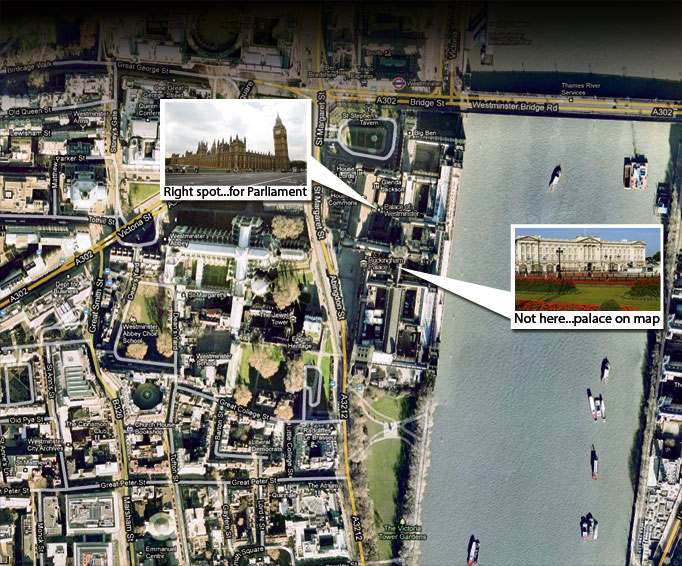 Άλλο μπελά δεν ήθελε στο κεφάλι της η βασίλισσα της Αγγλίας, Ελισάβετ, ειδικά τώρα που ετοιμάζεται να παντρέψει τον εγγονό της… Έτσι υποθέτουμε ότι θα εκπλησσόταν αν μάθαινε ότι η υπηρεσία Google Maps τοποθετεί τα Ανάκτορα του Μπάκινχαμ περίπου ένα χιλιόμετρο απ’ όπου πραγματικά βρίσκονται, στο κεντρικό Λονδίνο.
