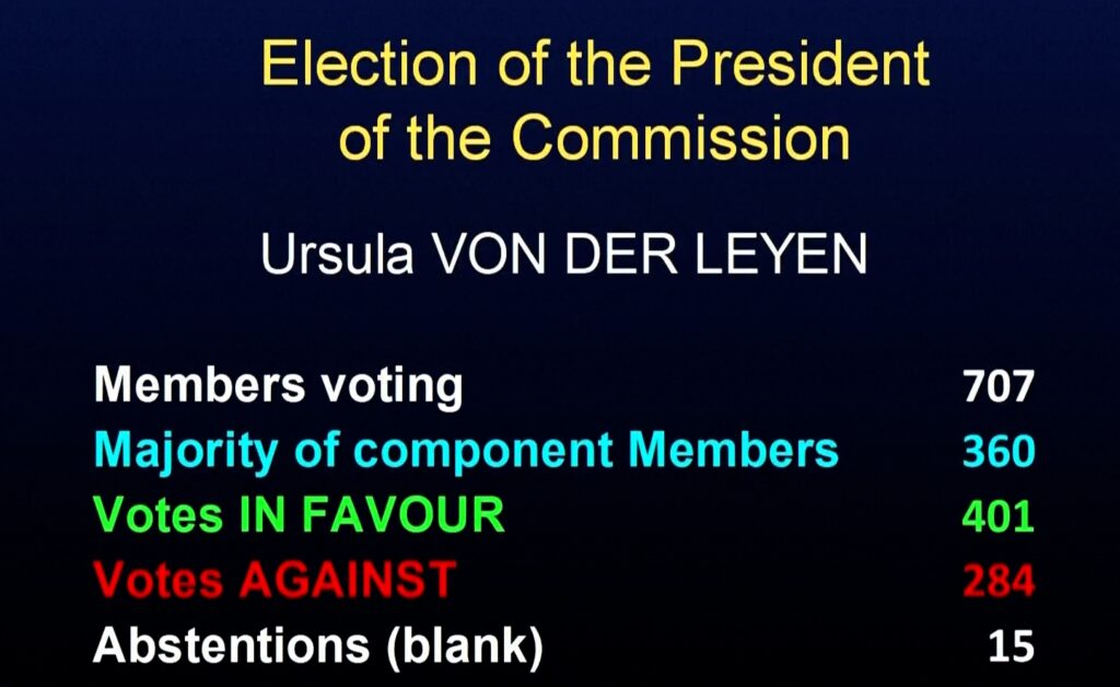 Η πρόεδρος της Κομισιόν επανεξελέγη με 401 ψήφους. Κατά της προέδρου ψήφισαν 284 μέλη του Ευρωκοινοβουλίου, ενώ υπήρξαν και 15 απουσίες.