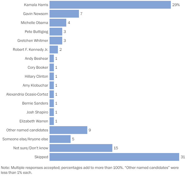 Μια δημοσκόπηση των «Washington Post-ABC News-Ipsos» αυτόν τον μήνα έδειξε ότι το 44% των Αμερικανών συνολικά δήλωσαν ότι θα ήταν «ικανοποιημένοι» αν ο Μπάιντεν έκανε στην άκρη και η Χάρις γινόταν υποψήφια των Δημοκρατικών, συμπεριλαμβανομένου του 70% των Δημοκρατικών και των ανεξάρτητων που κλίνουν προς τους Δημοκρατικούς. Στην ίδια δημοσκόπηση, το 29% των Δημοκρατικών και των ανεξάρτητων που προσανατολίζονται προς το Δημοκρατικό Κόμμα πρότειναν τη Χάρις ως την επιλογή τους για το χρίσμα του κόμματος, εάν ο Μπάιντεν αποχωρήσει, ενώ το 7% επιθυμεί τον κυβερνήτη της Καλιφόρνιας, Γκάβιν Νιούσομ, το 4% την πρώην πρώτη κυρία, Μισέλ Ομπάμα, και το 3% τον υπουργό Μεταφορών, Πιτ Μπάτιγκιγκ, και την κυβερνήτη του Μίσιγκαν, Γκρέτσεν Γουίτμερ. Οι μισοί από τους Δημοκρατικούς δεν κατονόμασαν κανέναν.