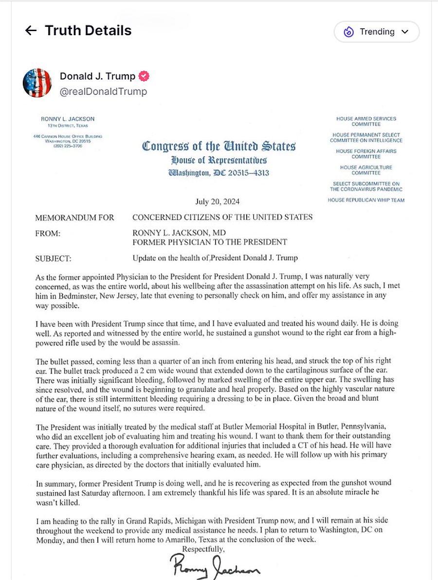 Ο Ντόναλντ Τραμπ δημοσίευσε στην πλατφόρμα κοινωνικής δικτύωσης Truth Social Media μια επιστολή-γνωμάτευση από τον βουλευτή του Τέξας, Ρόνι Τζάκσον, τον πρώην γιατρό του, στην οποία καταγράφει την κατάσταση της υγείας του μετά την απόπειρα δολοφονίας της περασμένης εβδομάδας.
