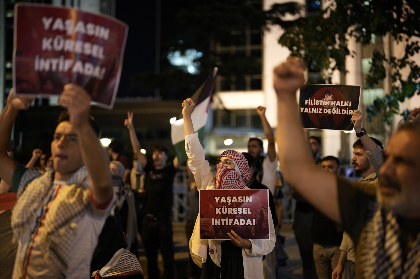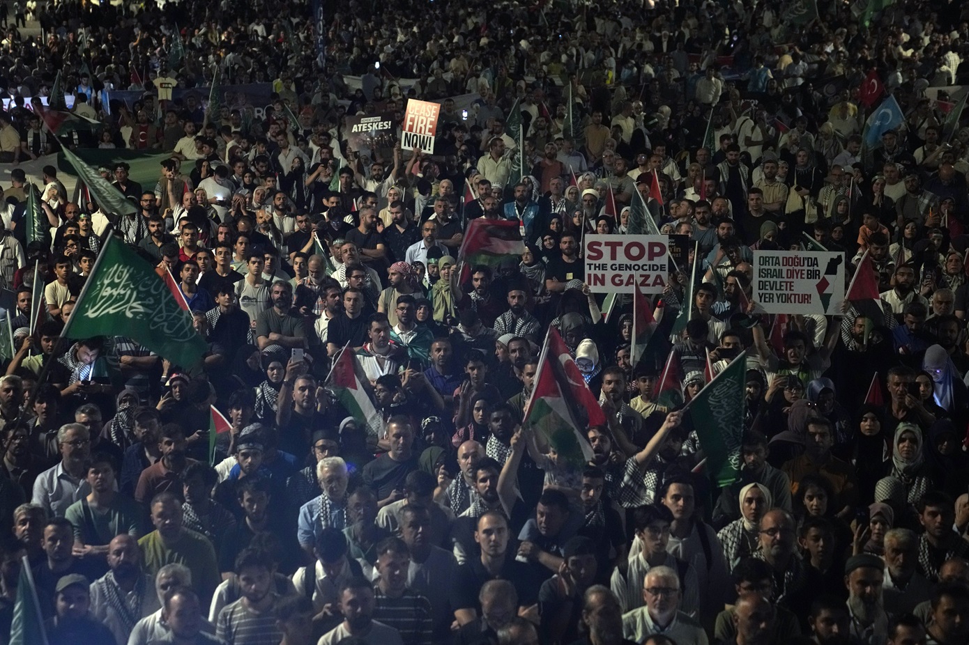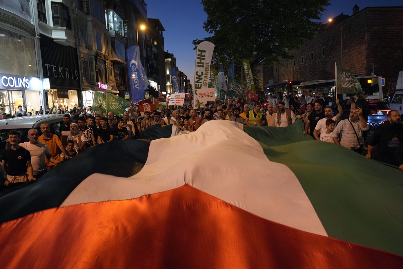 Χιλιάδες φιλοπαλαιστίνιοι διαδηλωτές πραγματοποίησαν πορεία απόψε στο κέντρο της Κωνσταντινούπολης, διαμαρτυρόμενοι για τη δολοφονία του ηγέτη της Χαμάς.