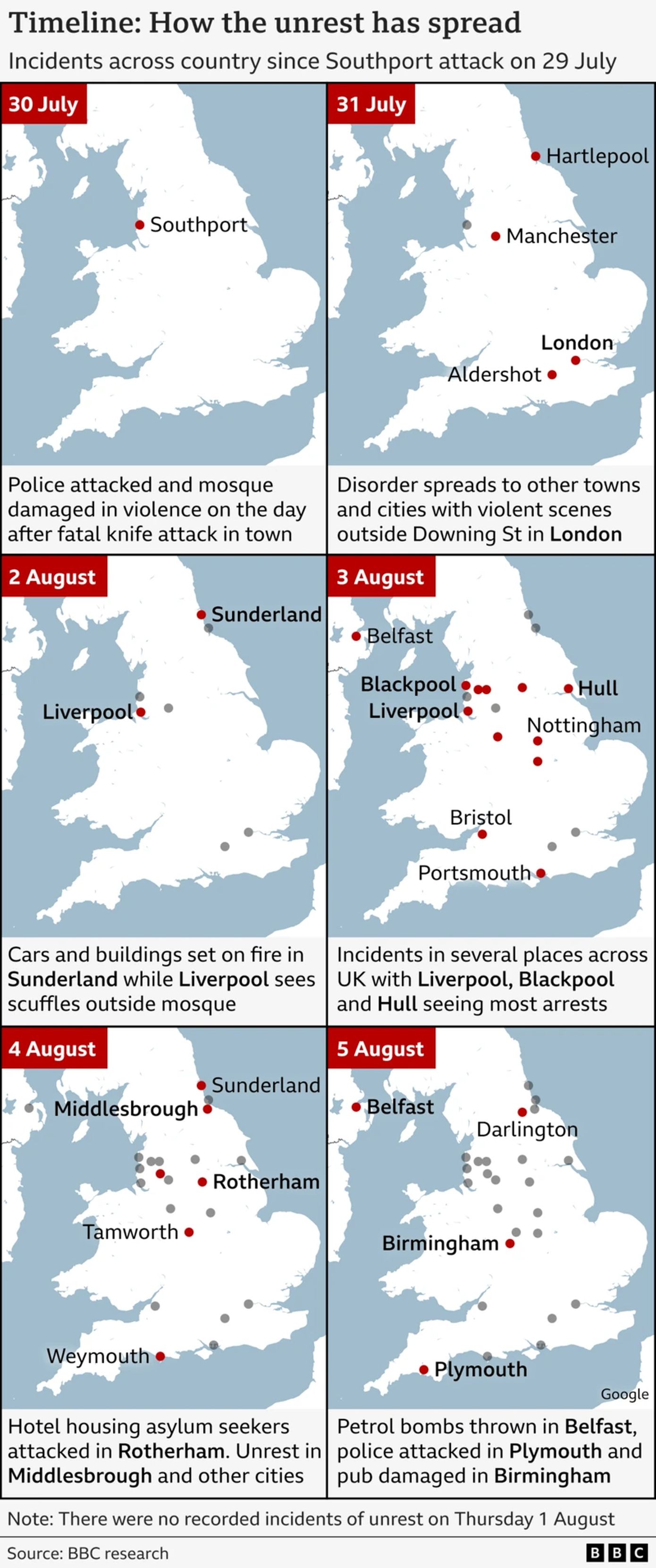 Ο πρωθυπουργός Κιρ Στάρμερ, του Εργατικού Κόμματος, υποσχέθηκε «γρήγορες» καταδίκες των ταραχοποιών και κατήγγειλε το «μίσος της άκρας δεξιάς».