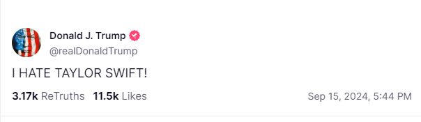 «ΜΙΣΩ ΤΗΝ ΤΕΙΛΟΡ ΣΟΥΙΦΤ!», έγραψε ο Τραμπ στο μέσο κοινωνικής δικτύωσης, Truth Social με κεφαλαία γράμματα.