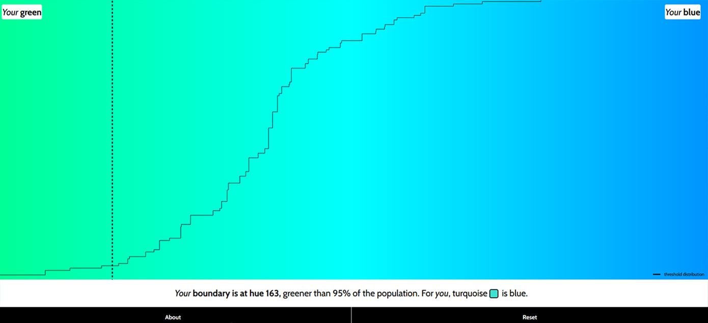 «Αυτό είναι ενδιαφέρον, διότι το όριο μεταξύ του μπλε και του πράσινου βρίσκεται στο 180, το ονομαζόμενο κυανό χρώμα της HTML. Αυτό σημαίνει ότι τα όρια των περισσότερων ανθρώπων έχουν μετατοπιστεί προς το να λένε ότι το κυανό είναι μπλε».