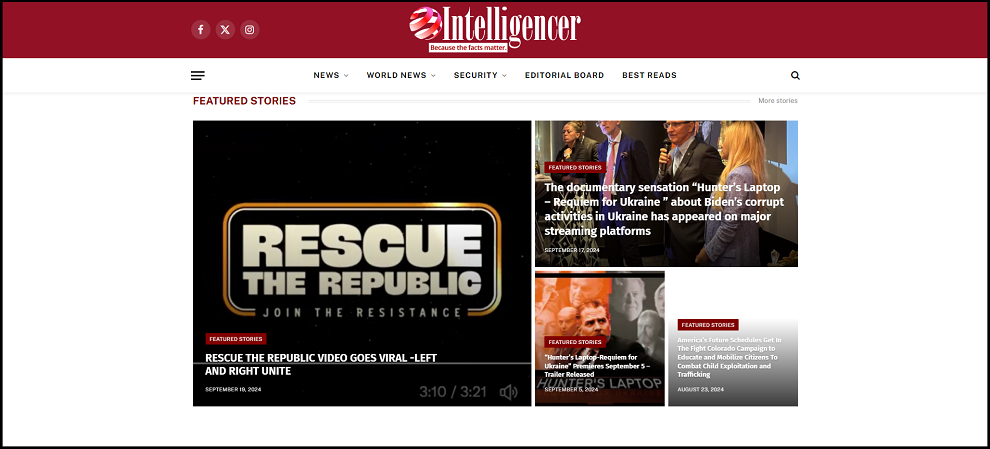Ο ιστότοπος ονομάζεται Intelligencer και προωθεί φιλορωσικές θέσεις για τον πόλεμο στην Ουκρανία, διαδίδει ψευδείς ειδήσεις για τον κορονοϊό και τα εμβόλια, ενώ υποστηρίζει ότι στην Αμερική το βασικό πρόβλημα είναι η πολιτιστική μάχη και όχι το χάσμα ανάμεσα σε φτωχούς και πλούσιους, το οποίο γιγαντώνεται.