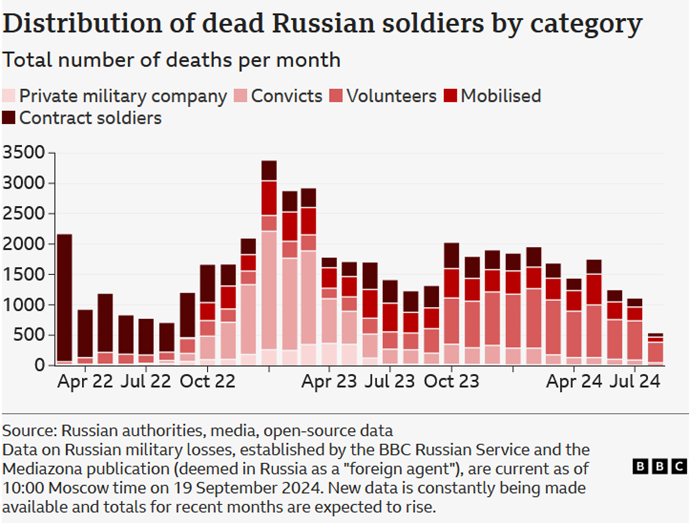 Μεταξύ αυτών, 13.781 ήταν εθελοντές – περίπου το 20% – και οι θάνατοι μεταξύ των εθελοντών ξεπερνούν πλέον τις άλλες κατηγορίες. Οι πρώην κρατούμενοι, οι οποίοι κατατάχθηκαν με αντάλλαγμα την απονομή χάριτος για τα εγκλήματά τους, ήταν προηγουμένως οι περισσότεροι, αλλά τώρα αντιπροσωπεύουν το 19% όλων των επιβεβαιωμένων θανάτων. Οι στρατιώτες – πολίτες (mobilised) που καλούνται να πολεμήσουν αντιστοιχούν στο 13%.