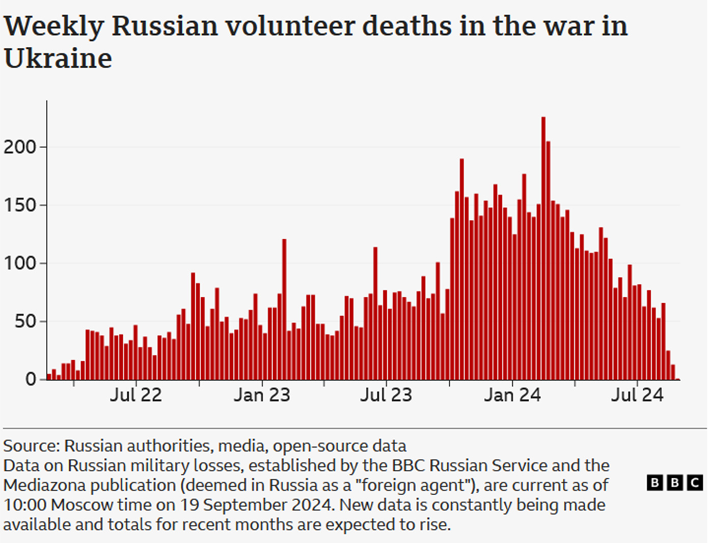 Το ρωσικό BBC και ο ανεξάρτητος ιστότοπος Mediazona έχουν συγκεντρώσει αυτά τα ονόματα, μαζί με ονόματα από άλλες ανοιχτές πηγές, συμπεριλαμβανομένων των επίσημων αναφορών. Οι πληροφορίες είχαν κοινοποιηθεί από τις αρχές ή τους συγγενείς των θανόντων και είχαν αναγνωριστεί ότι πέθαναν στον πόλεμο.
