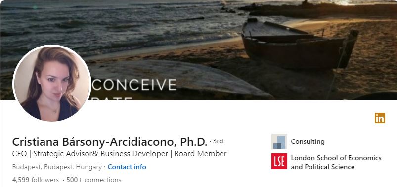 Η Cristiana Barsony-Arcidiacono έχει διδακτορικό στη φυσική από το UCL, στο οποίο φοίτησε μεταξύ 2002 και 2006. Στη συνέχεια σπούδασε στο London School of Economics και στο Πανεπιστήμιο του Λονδίνου για διάφορους μεταπτυχιακούς τίτλους σπουδών μεταξύ 2009 και 2017, όπως αναφέρει στη σελίδα της στο LinkedIn. Μιλάει επτά γλώσσες (ανάμεσά τους ρωσικά και ιταλικά), όπως αναφέρει στο βιογραφικό της.