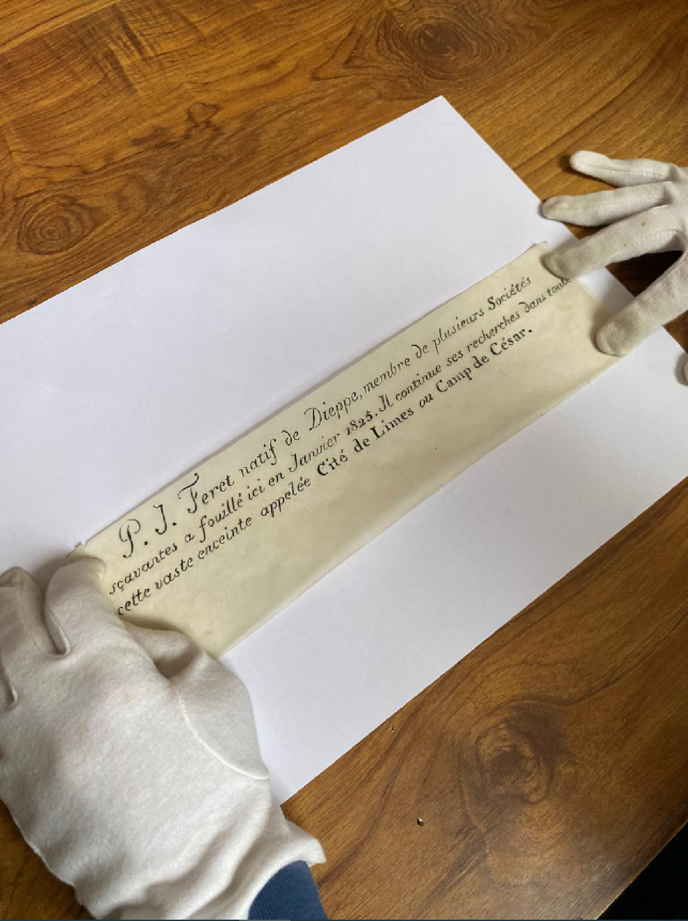 «Ο P.J. Féret, καταγόμενος από τη Dieppe, μέλος επιστημονικών ομάδων, πραγματοποίησε ανασκαφές εδώ τον Ιανουάριο του 1825. Συνεχίζει τις έρευνές του σε αυτή την τεράστια περιοχή που είναι γνωστή ως Cité de Limes ή “στρατόπεδο του Καίσαρα”», ήταν το μήνυμα που περιείχε το μπουκάλι.