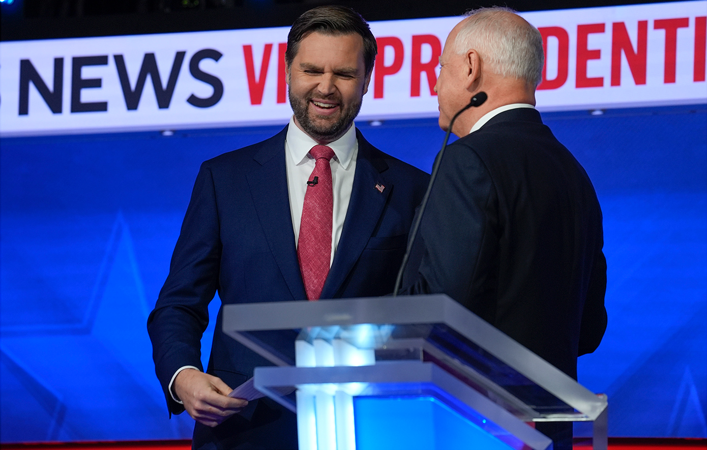 Οι δύο αντίπαλοι, που έχουν επιτεθεί ο ένας στον άλλον στη διάρκεια της προεκλογικής εκστρατείας, διατήρησαν ήρεμο τόνο και προτίμησαν να επικεντρώσουν τα πυρά τους στους υποψήφιους προέδρους, τη Δημοκρατική αντιπρόεδρο, Κάμαλα Χάρις, και τον Ρεπουμπλικάνο, Ντόναλντ Τραμπ.