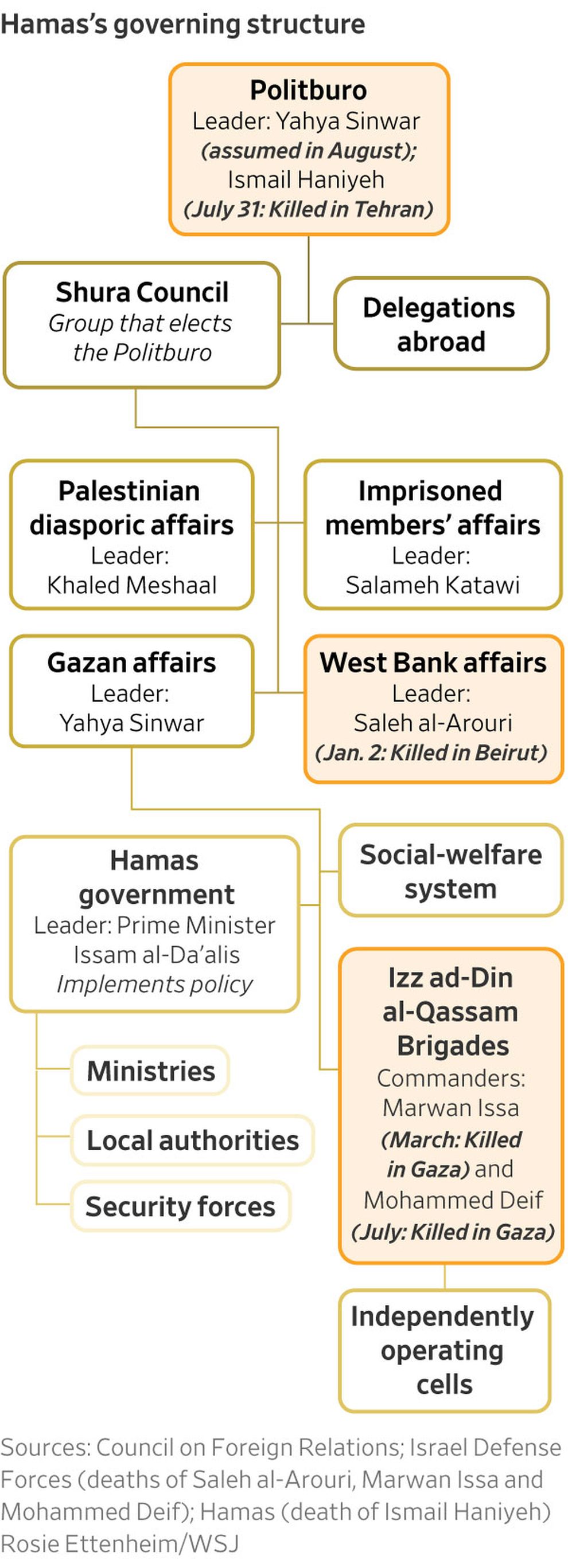 Σημειώνεται ότι μετά τη δολοφονία του Χανίγια τον Ιούλιο, πολιτικοί αξιωματούχοι της Χαμάς φέρεται να είχαν προτείνει ως διάδοχό του τον πρώην ηγέτη της οργάνωσης, Χαλέντ Μεσάαλ, πριν η στρατιωτική πτέρυγα υπό την ηγεσία του Σινουάρ, οι Ταξιαρχίες αλ Κασάμ, να στείλουν μήνυμα ότι έπρεπε να επιλεγεί ο επικεφαλής τους.