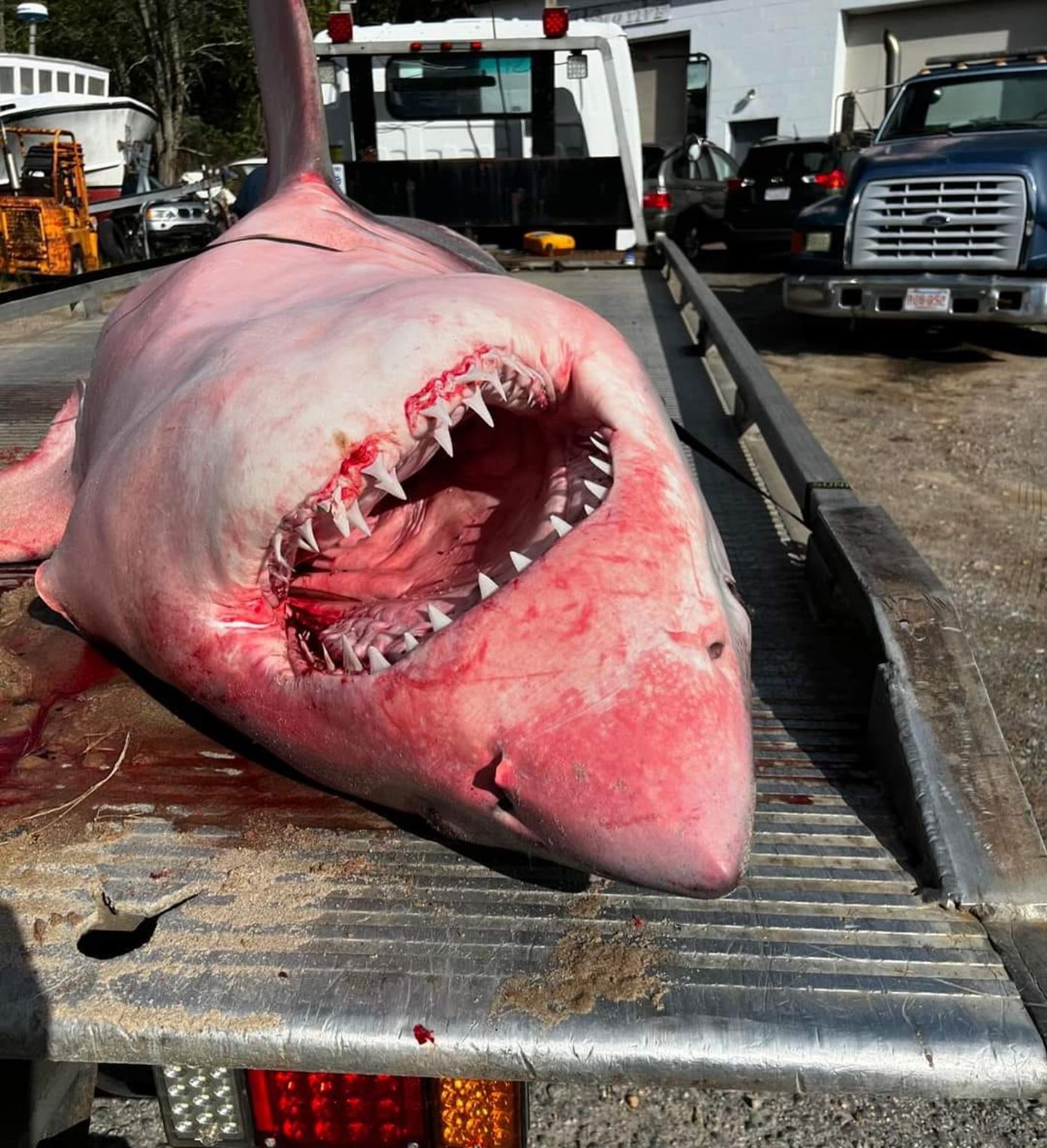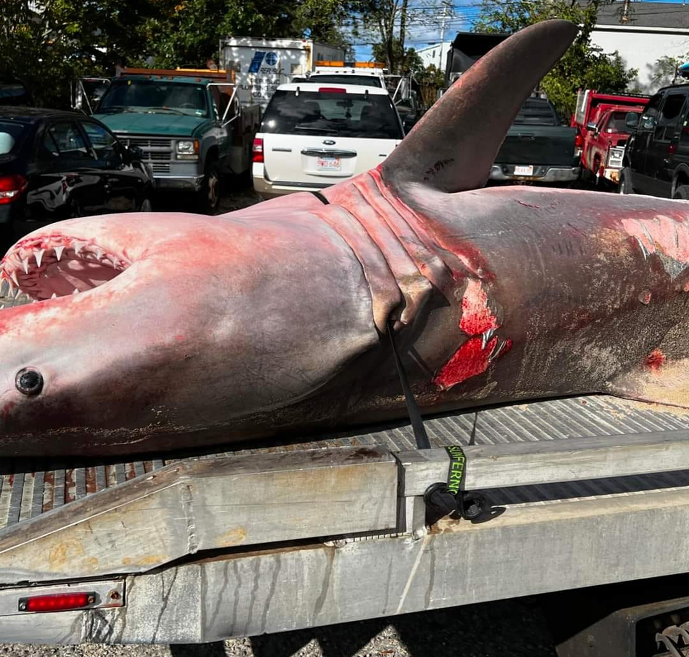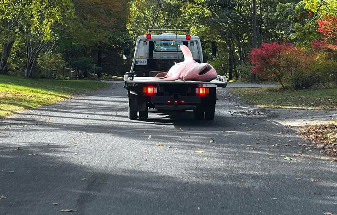 Ένας λευκός καρχαρίας 3,5 μέτρων που ξεβράστηκε σε παραλία της Μασαχουσέτης αυτή την εβδομάδα χρειάστηκε φορτωθεί σε ένα μικρό φορτηγό για να μεταφερθεί.