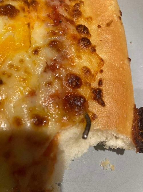 Όπως αναφέρει η Daily Mail το αντικείμενο, το οποίο έχει δύο άκρα, καλύπτει σχεδόν ένα ολόκληρο κομμάτι της πίτσας. Μία κοντινή λήψη δείχνει το αντικείμενο κάτω από μία στρώση τυριού. Μία άλλη φωτογραφία εστιάζει σε μία κοφτερή άκρη του αντικειμένου, που προεξέχει από την άκρη της κρούστας.
