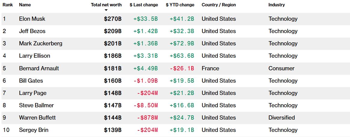 Η συνολική καθαρή αξία του Έλον Μασκ εκτινάσσεται πλέον στα 270 δισεκατομμύρια δολάρια, σύμφωνα με στοιχεία του Bloomberg και η άνοδος της μετοχής της Tesla κατοχύρωσε τη θέση του Μασκ ως το πλουσιότερο άτομο στον κόσμο, μπροστά από άλλα στελέχη στην κορυφή της λίστας, όπως ο Jeff Bezos και ο Larry Ellison.