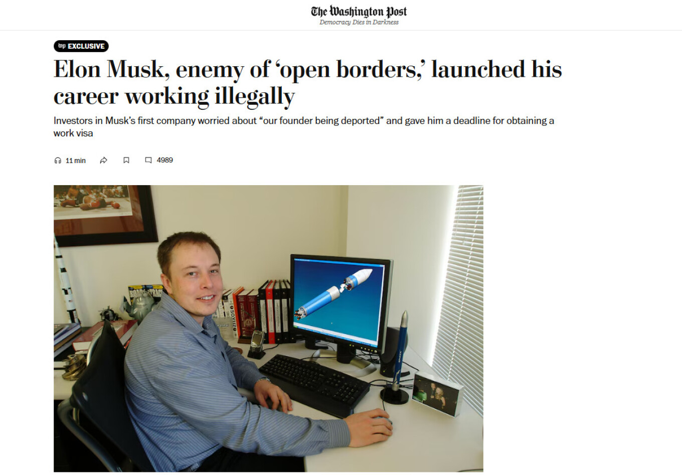 Αν και σφοδρός πολέμιος της χαλαρής μεταναστευτικής πολιτικής, και -για αυτό, ένθερμος υποστηρικτής του Ντόναλντ Τραμπ στις επερχόμενες προεδρικές εκλογές- ο Έλον Μασκ φαίνεται πως είχε ξεκινήσει την καριέρα του ευρισκόμενος παράνομα στις Ηνωμένες Πολιτείες, όπως αποκαλύπτει η Washington Post.