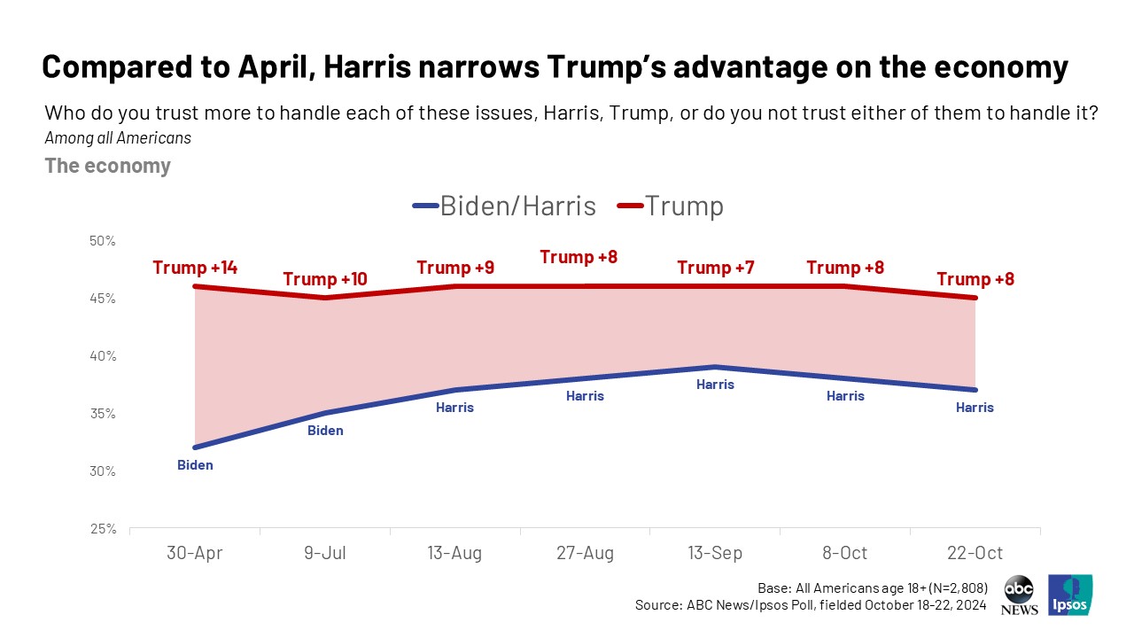 Η οικονομία και ο πληθωρισμός εξακολουθούν να αποτελούν τις σημαντικότερες ανησυχίες, με το 90% και το 85% των εγγεγραμμένων ψηφοφόρων, αντίστοιχα, να τα χαρακτηρίζουν πολύ σημαντικά για την ψήφο τους. Αλλά αυτή η δημοσκόπηση, που εκπονήθηκε για το ABC από τη Langer Research Associates, με επιτόπια έρευνα από την Ipsos, διαπιστώνει μια αλλαγή στην ένταση: Τα ποσοστά που αποδίδουν ύψιστη σημασία στην οικονομία ή τον πληθωρισμό, χαρακτηρίζοντάς τα «ένα από τα σημαντικότερα ζητήματα» στην ψήφο τους, έχουν μειωθεί κατά 7 μονάδες το καθένα από τον Σεπτέμβριο.