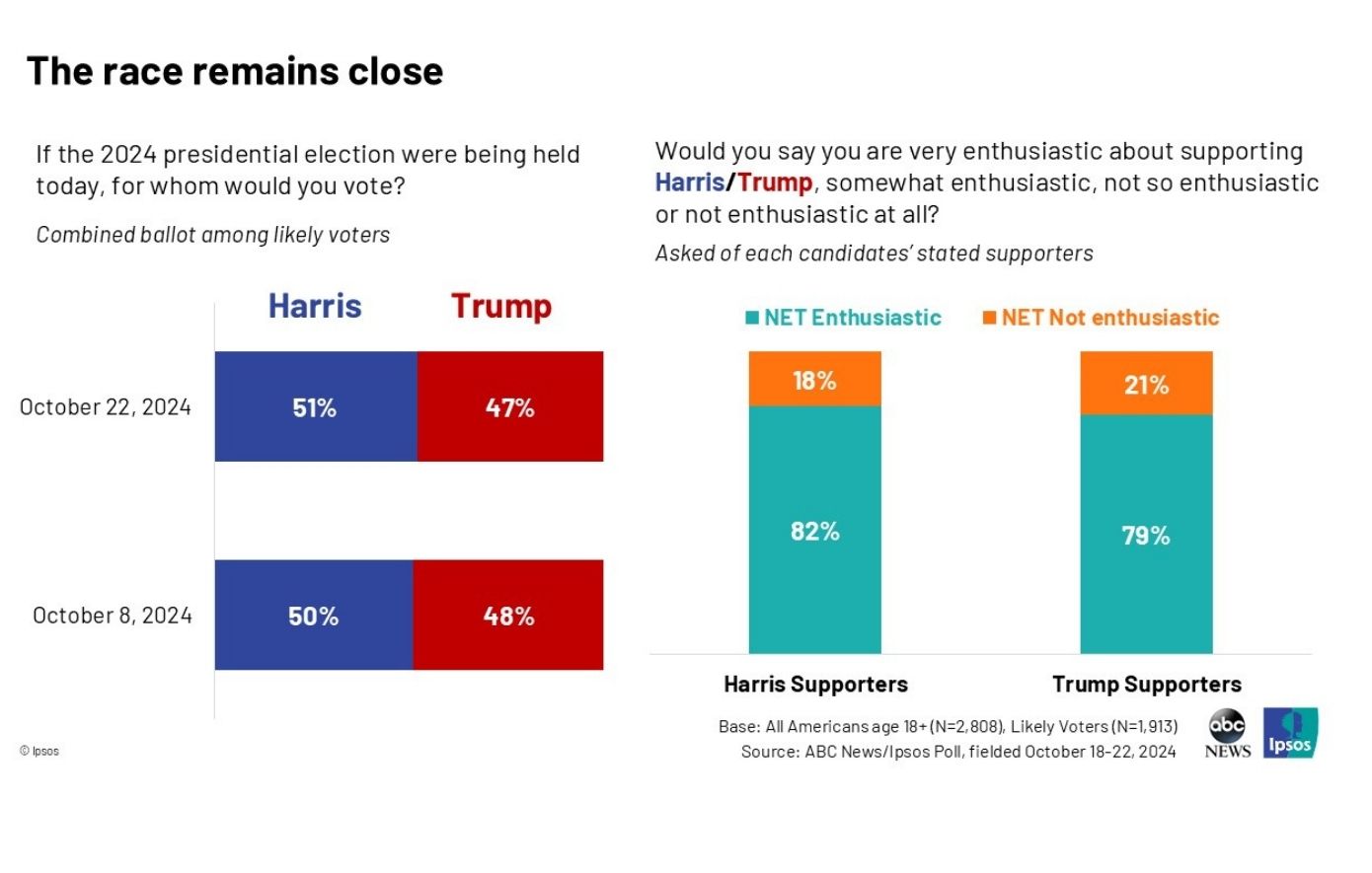 Μέχρι στιγμής, μόλις 2 ποσοστιαίες μονάδες χωρίζουν την Κάμαλα Χάρις και τον Ντόναλντ Τραμπ, μεταξύ όλων των εγγεγραμμένων ψηφοφόρων, με τα ποσοστά στο 49-47%. Αυτό μεταφράζεται σε ένα ελαφρύ πλεονέκτημα της Χάρις μεταξύ των πιθανών ψηφοφόρων, με ποσοστά 51-47%, ενώ ορισμένες ομάδες που τάσσονται υπέρ της Χάρις, δείχνουν λίγο μεγαλύτερη διάθεση να ψηφίσουν.