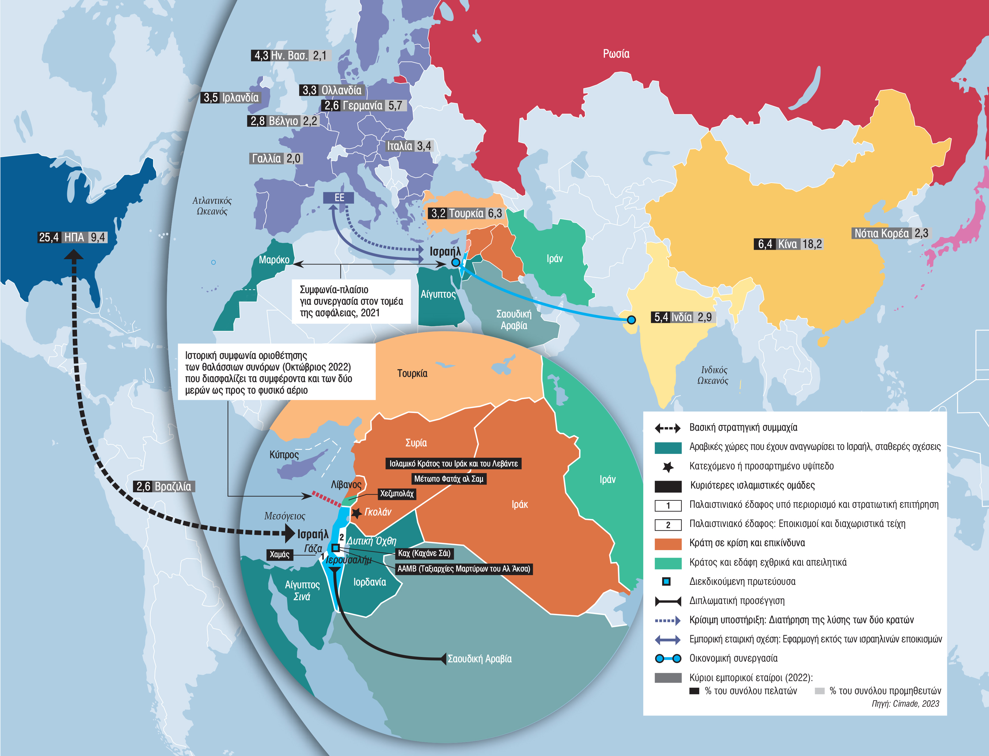 Από την ημέρα, δηλαδή, που ένοπλα τμήματα της παλαιστινιακής οργάνωσης Χαμάς πραγματοποίησαν επιδρομή στο έδαφος του Ισραήλ σκοτώνοντας περίπου 1.200 πολίτες που μετείχαν σε υπαίθριο πάρτι ή ζούσαν σε συνοριακά κιμπούτς (οικιστικές κοινότητες που λειτουργούν με συλλογικότητα) και παίρνοντας 251 άτομα ως ομήρους. Λίγες ημέρες αργότερα η ισραηλινή κυβέρνηση του Μπενιαμίν Νετανιάχου προχωρούσε σε ευρείας κλίμακας στρατιωτικές επιχειρήσεις κατά της Λωρίδας της Γάζας, στην οποία κατοικούν πάνω από 1,5 εκατομμύριο Παλαιστίνιοι, ώστε «να εξολοθρεύσουν τους τρομοκράτες, απ’ όπου κι αν προέρχονται, στο πλαίσιο του νόμιμου δικαιώματος της χώρας για αυτοάμυνα», όπως υποστήριξε το Τελ Αβίβ. Ας δούμε λοιπόν αναλυτικά την πορεία του Ισραήλ, του αραβικού κόσμου και του Ιράν που εμπλέκεται στα όσα συμβαίνουν, με τη βοήθεια (και) κατατοπιστικών χαρτών.