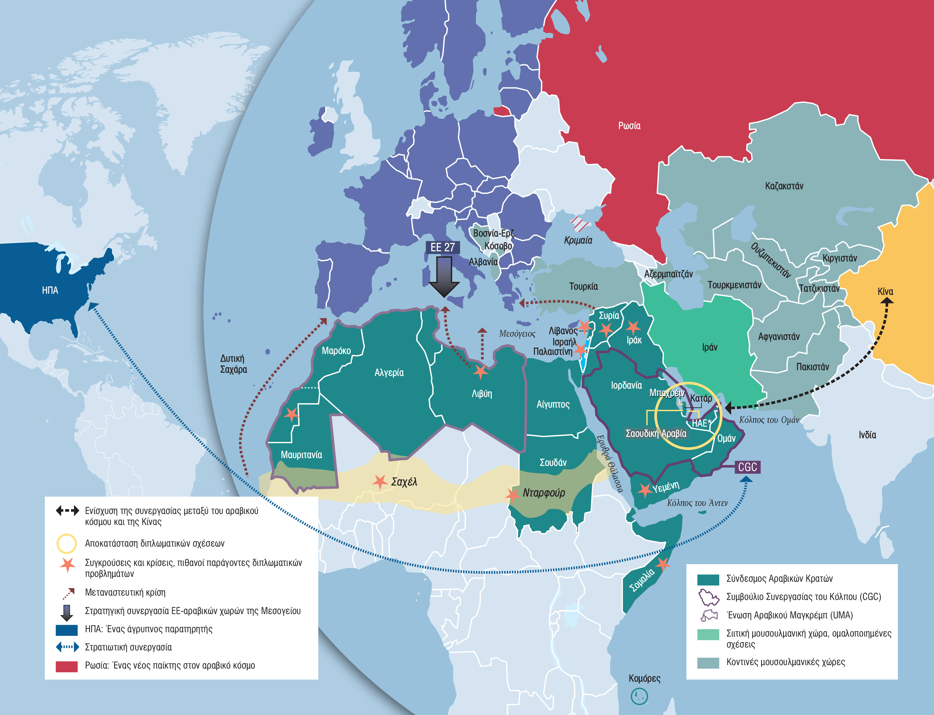 Ορισμένα καθεστώτα εργαλειοποιούν εδώ και καιρό το παλαιστινιακό ζήτημα για να συγκαλύψουν τα εσωτερικά δημοκρατικά και κοινωνικά τους ελλείμματα, ενώ το ίδιο κάνουν για τους δικούς τους λόγους και οι ισλαμιστές. Ο πόλεμος στο Ιράκ συνέβαλε περαιτέρω στη ριζοσπαστικοποίηση και την απογοήτευση. Ο εκδημοκρατισμός που επιβλήθηκε έξωθεν αποδείχθηκε αδύνατος ή περιπετειώδης. Ο αραβικός κόσμος είναι βαθιά διχασμένος και αποδυναμωμένος. Η «Αραβική Άνοιξη» έσβησε γρήγορα ή απέτυχε: το Ιράκ, η Συρία, η Λιβύη, η Υεμένη και η Αίγυπτος βυθίστηκαν στη βία και έχασαν μεγάλο μέρος της δύναμής τους. Στην Τυνησία μάλιστα επανέρχεται πλέον ο αυταρχισμός.