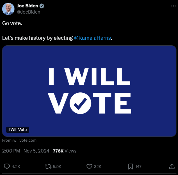 Με ανάρτησή του στο Χ ο πρόεδρος των ΗΠΑ είπε στους Αμερικανούς πολίτες να γράψουν ιστορία με την εκλογή της υποψήφιας με το κόμμα των Δημοκρατικών Κάμαλα Χάρις.