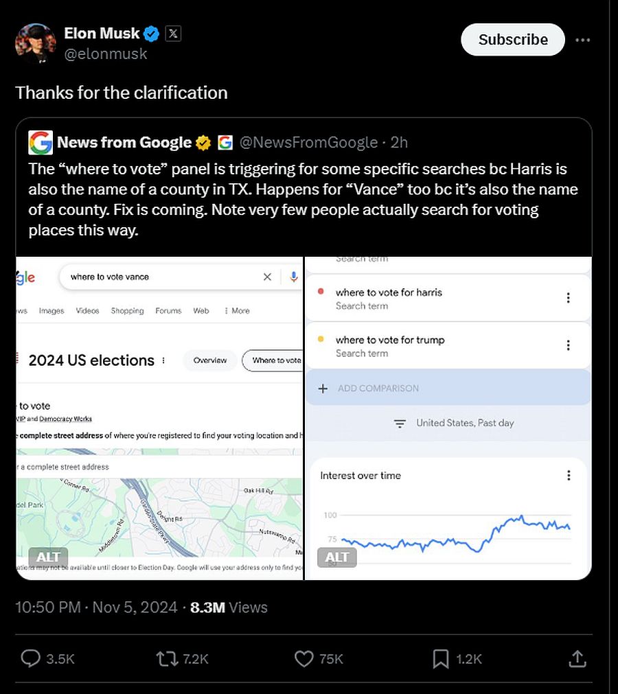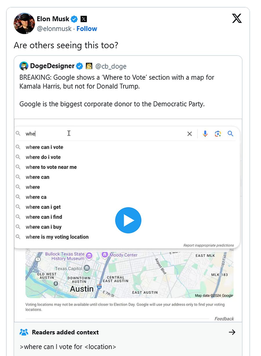 Ο Έλον Μασκ αναδημοσίευσε βίντεο από αναζήτηση στο Google με τις ερωτήσεις «που ψηφίζω για τον Τραμπ» και «που ψηφίζω για την Χάρις».