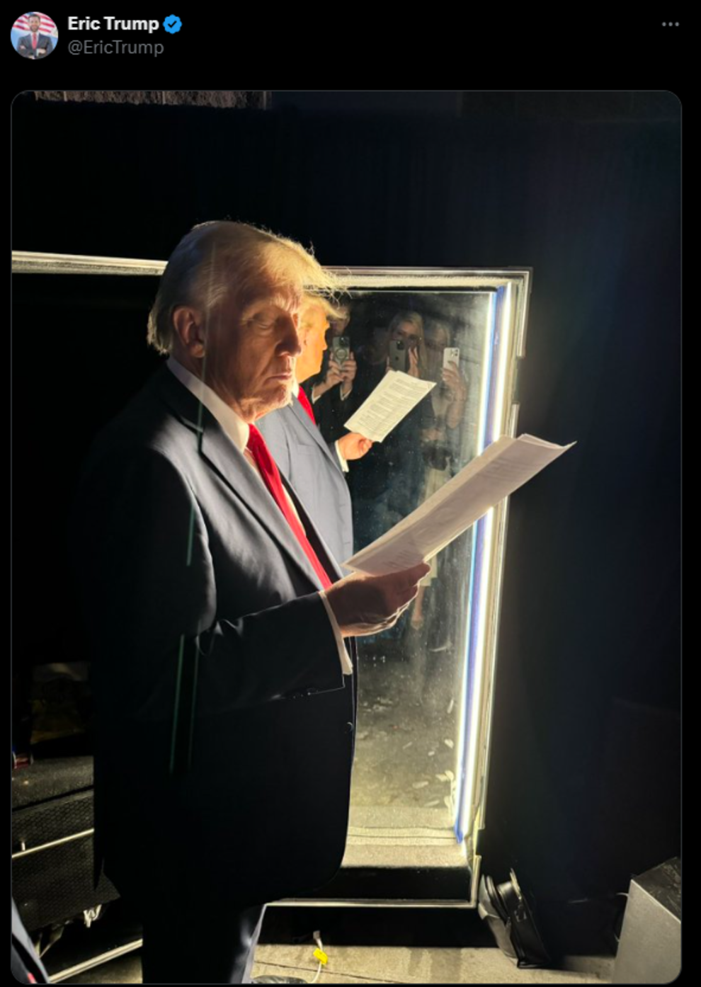 Το σχετικό στιγμιότυπο ανέβασε στο Χ o γιος του Τραμπ, Έρικ, λίγα λεπτά πριν ο πατέρας του ανέβει στη σκηνή.