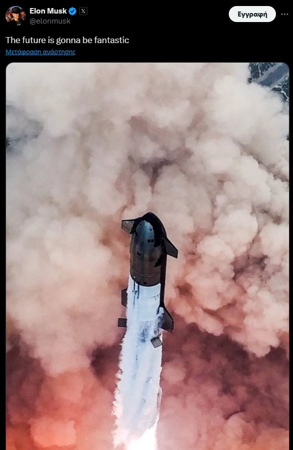 «Το μέλλον θα είναι φανταστικό» έγραψε ο Έλον Μασκ στο X, μαζί με μια φωτογραφία του πυραύλου «Starship», μετά την επανεκλογή Τραμπ στις αμερικανικές εκλογές.