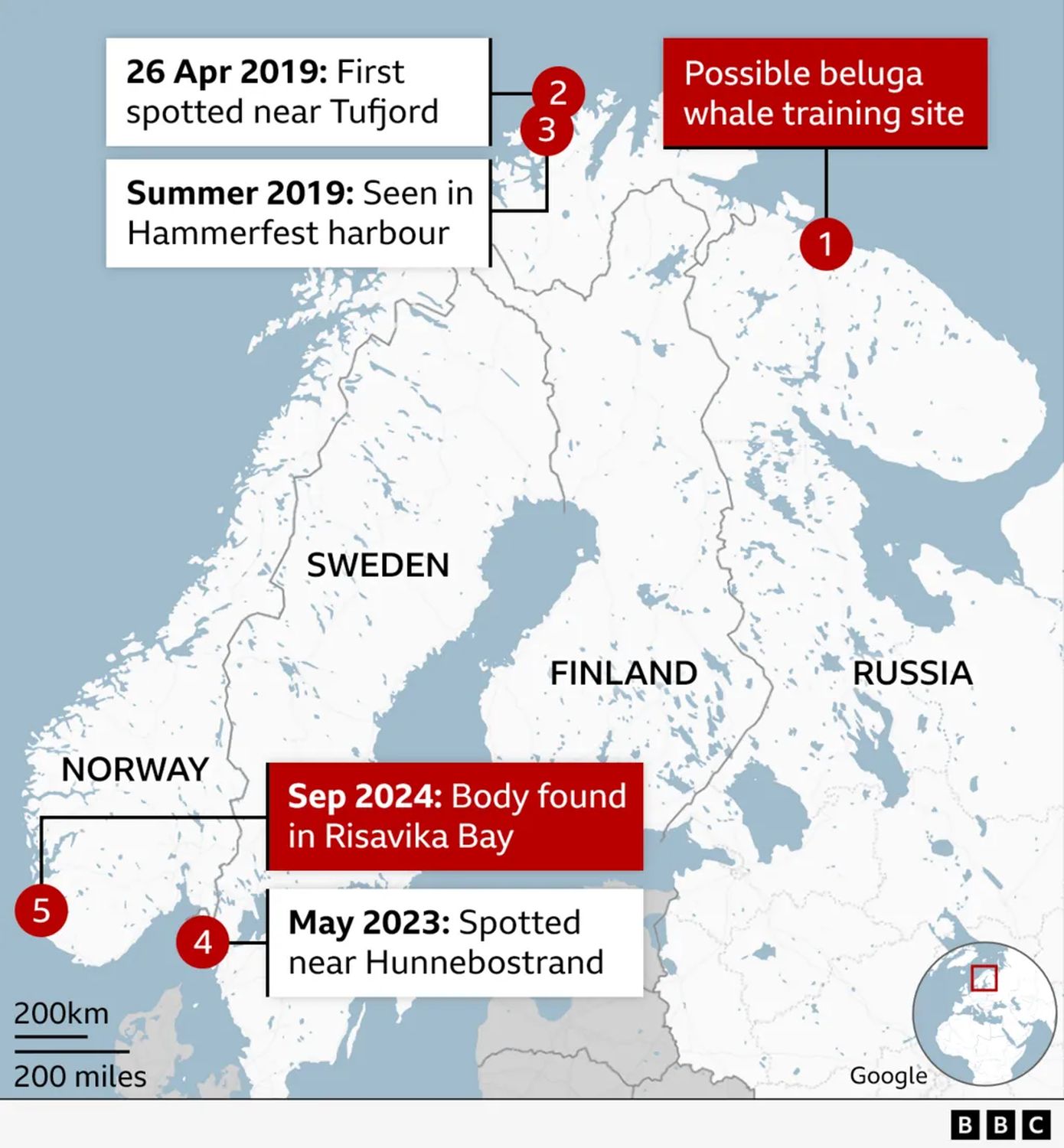 Ήταν κάτι ασυνήθιστο επειδή η μπελούγκα ήταν τόσο ήμερη και σπάνια τις βλέπει κανείς τόσο νότια. Φορούσε επίσης μια εξάρτυση, η οποία είχε μια βάση για μια φωτογραφική μηχανή και έφερε τις λέξεις, στα αγγλικά «Εξοπλισμός Αγίας Πετρούπολης», αναφέρει το BBC.