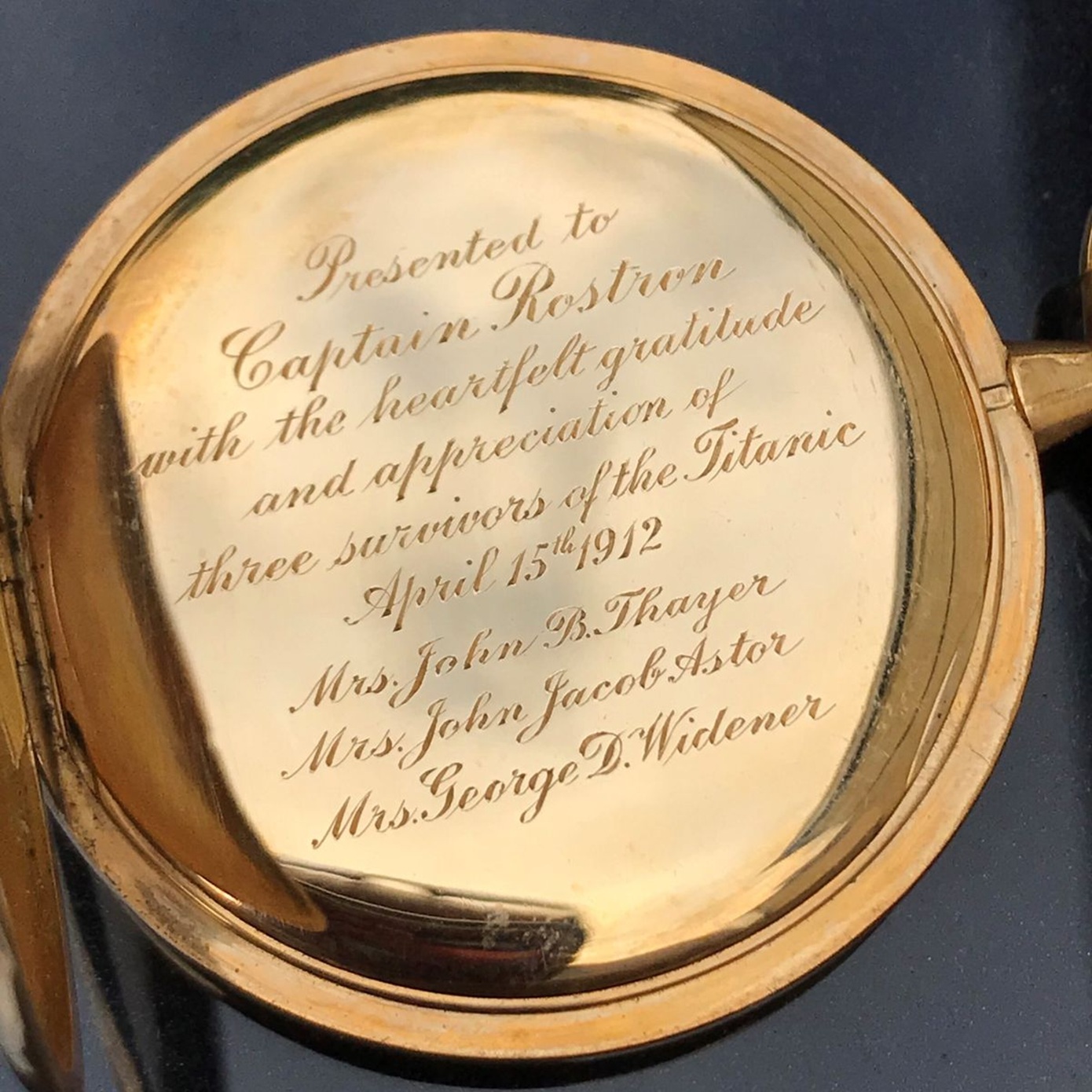 Το ρολόι τσέπης 18 καρατίων της Tiffany & Co δόθηκε στον καπετάνιο Άρθουρ Ρόστρον από τρεις χήρες υψηλόβαθμων και πλούσιων επιχειρηματιών που έχασαν τη ζωή τους όταν το πλοίο βυθίστηκε το 1912.