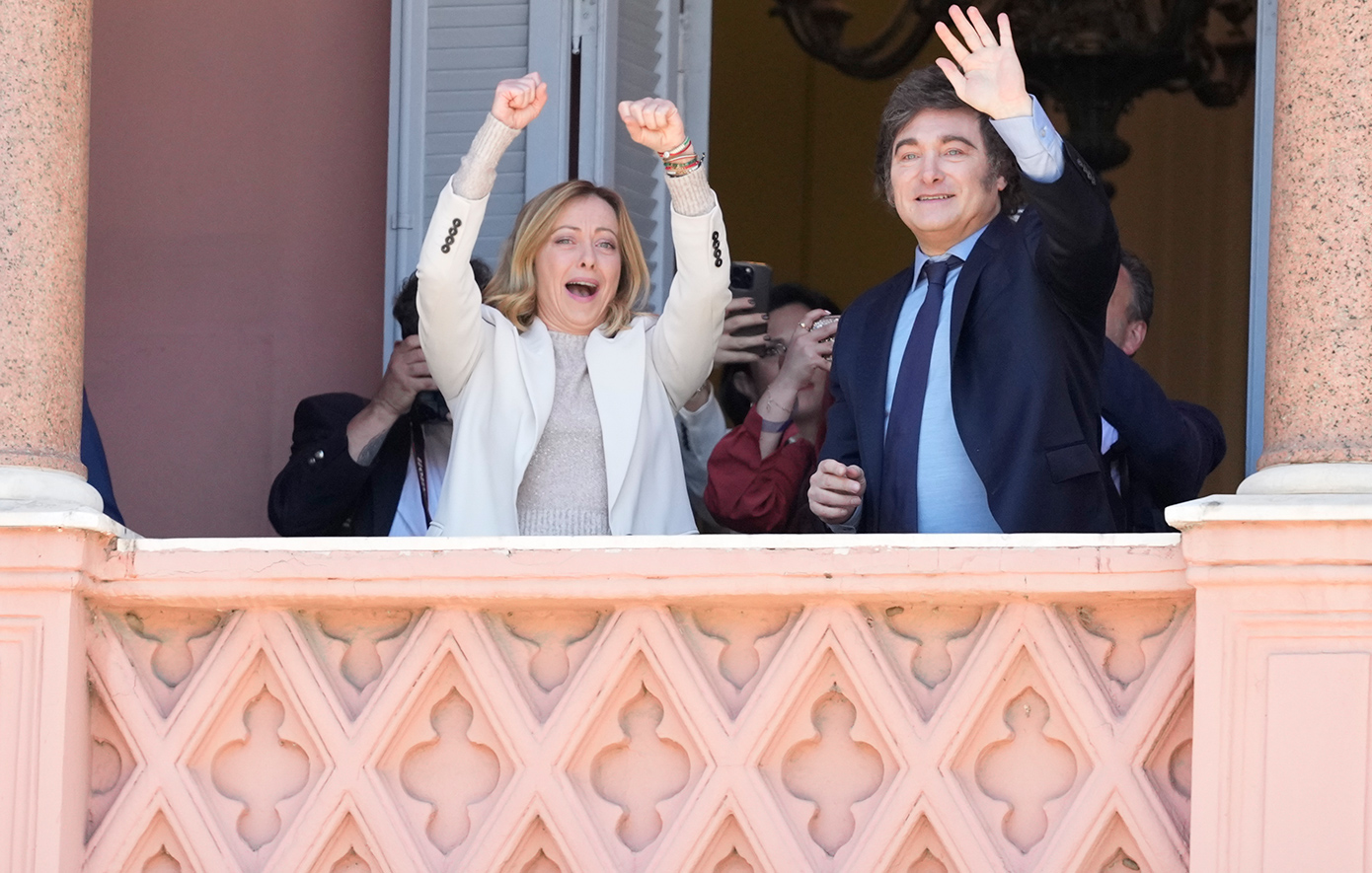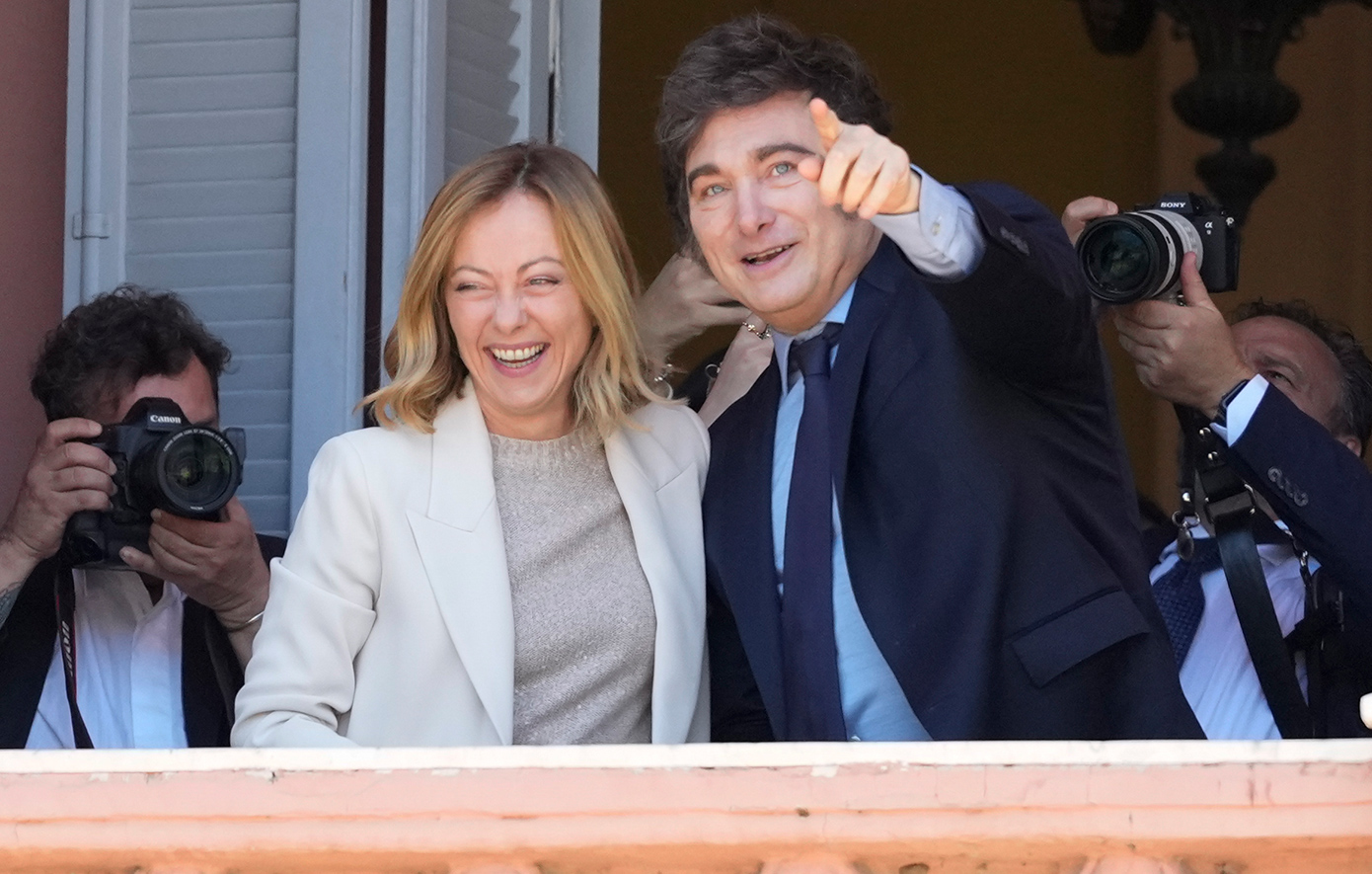 Ο ακραίος φιλελεύθερος πρόεδρος της Αργεντινής, Χαβιέρ Μιλέι, υποδέχθηκε χθες Τετάρτη στο Μπουένος Άιρες την ακροδεξιά πρωθυπουργό της Ιταλίας, Τζόρτζια Μελόνι, και οι δυο ηγέτες εξύμνησαν τη «συμμαχία ελεύθερων εθνών» ανάμεσα στις χώρες τους κι εξέφρασαν την υποστήριξή τους σε όσους «αγωνίζονται» κατ’ αυτούς για να προασπίσουν «την ελευθερία» στη Δύση.