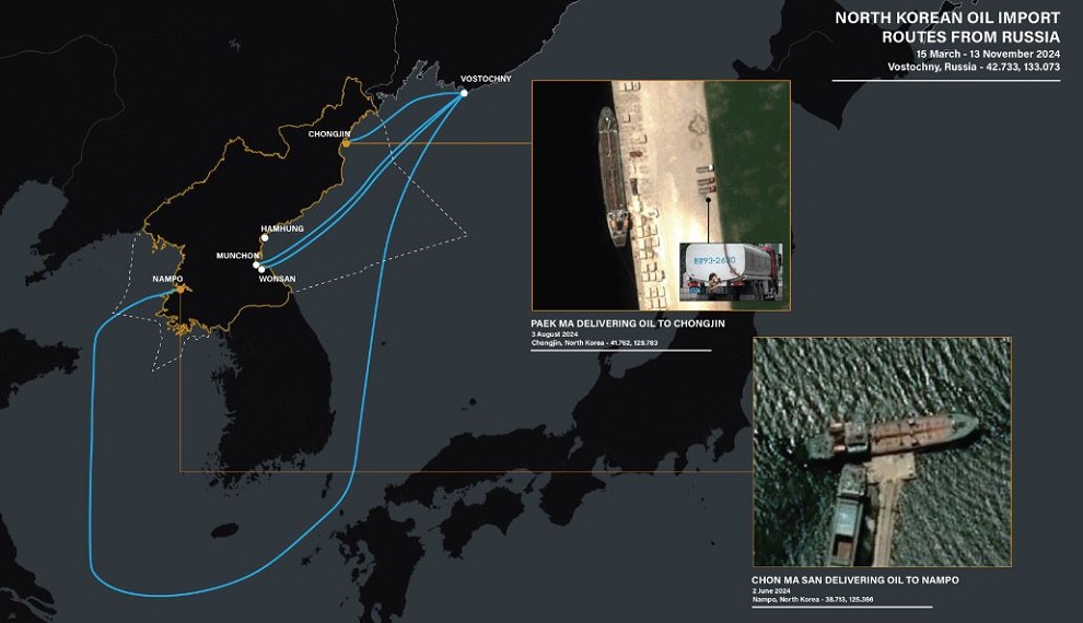 Δορυφορικές εικόνες, που κοινοποιήθηκαν αποκλειστικά στο BBC, δείχνουν πάνω από 12 βορειοκορεατικά πετρελαιοφόρα να φτάνουν σε τερματικό σταθμό πετρελαίου στην Άπω Ανατολή της Ρωσίας, σε συνολικά 43 δρομολόγια τους τελευταίους οκτώ μήνες. Οι εικόνες δείχνουν τα πλοία να καταφθάνουν άδεια και να φεύγουν σχεδόν γεμάτα.