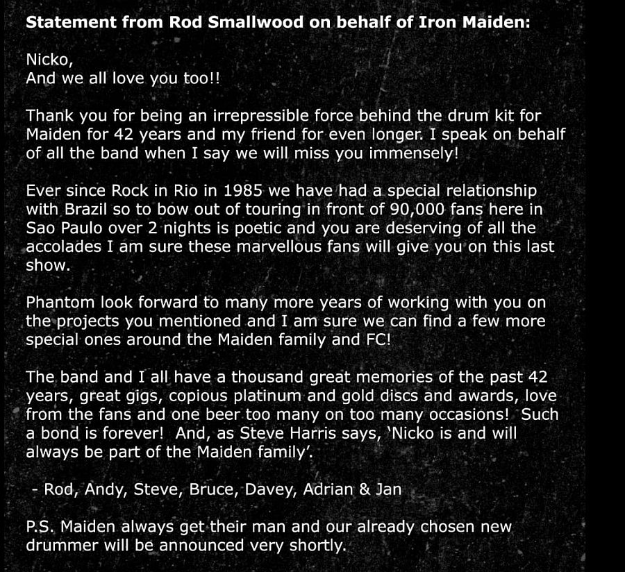 Από την πλευρά τους, οι Iron Maiden ευχαριστούν τον «φίλο τους» για αυτά τα 42 χρόνια, ενώ γνωστοποιούν και πως έχει βρεθεί αντικαταστάτης, το όνομα του οποίου θα ανακοινωθεί σύντομα.
