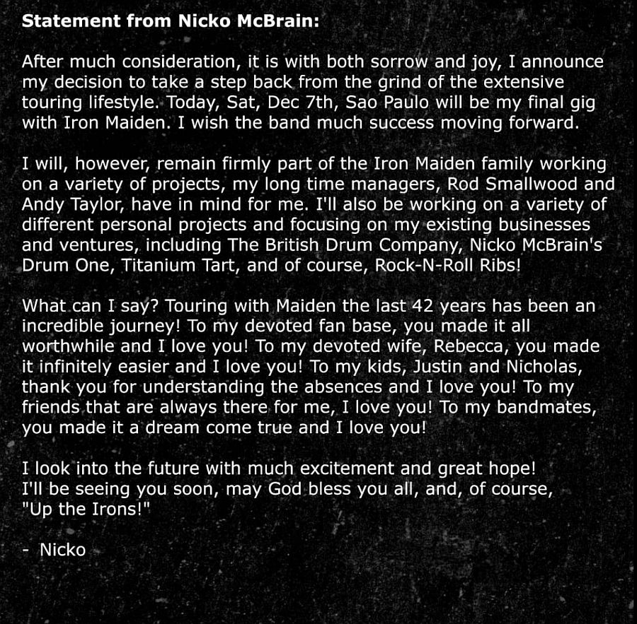 «Θα παραμείνω, ωστόσο, σταθερά μέλος της οικογένειας των Iron Maiden δουλεύοντας σε διάφορα πρότζεκτ, που έχουν στο μυαλό τους οι επί χρόνια μάνατζέρ μου, Rod Smallwood και Andy Taylor. Επίσης, θα δουλεύω σε διάφορα προσωπικά projects και θα επικεντρωθώ στις υπάρχουσες επιχειρήσεις και εγχειρήματά μου, συμπεριλαμβανομένων των The British Drum Company, Nicko McBrain’s Drum One, Titanium Tart και φυσικά Rock-N-Roll Ribs.