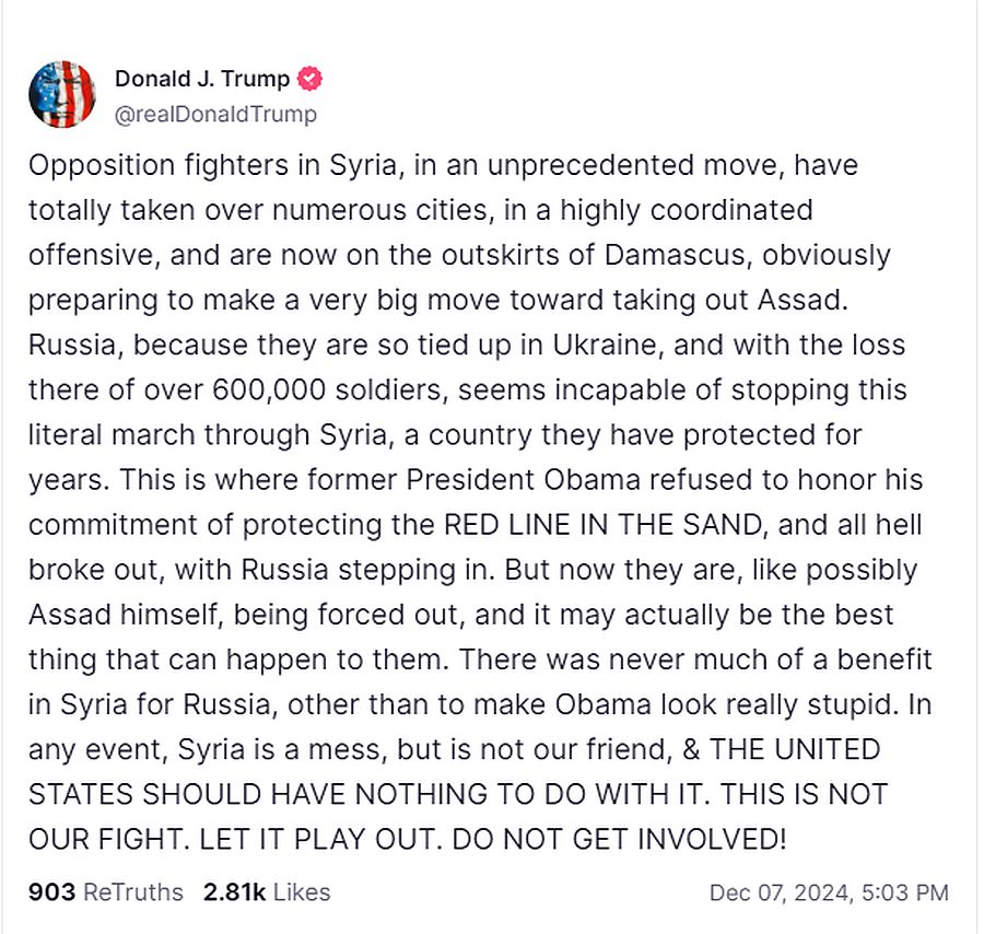 «Η Συρία είναι ένα χάος, αλλά δεν είναι φίλη μας και οι Ηνωμένες Πολιτείες δεν θα πρέπει να έχουν καμία σχέση με αυτό. Δεν είναι δικός μας αυτός ο αγώνας. Αφήστε τον να εξελιχθεί. Μην εμπλέκεστε!» ανέφερε σε ανάρτησή του στην πλατφόρμα Truth Social, με το μεγαλύτερο μέρος του μηνύματός του γραμμένο με κεφαλαία γράμματα.