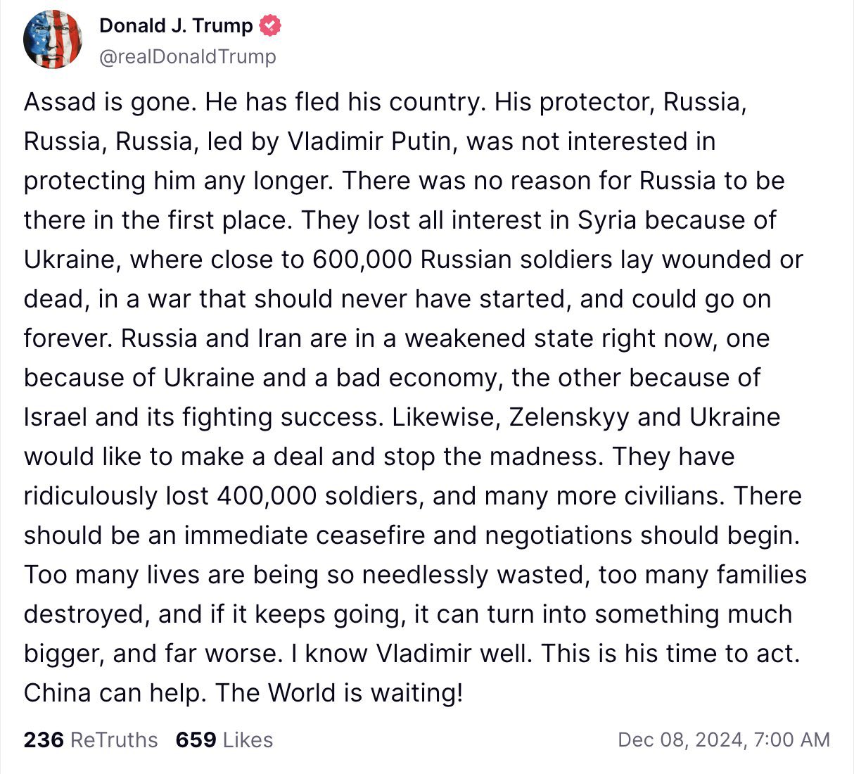 «Ο Άσαντ δεν είναι πια εδώ. Διέφυγε από τη χώρα του. Η προστάτιδά του, η Ρωσία, η Ρωσία, η Ρωσία, υπό την ηγεσία του Βλαντίμιρ Πούτιν, δεν επιθυμούσε πλέον να τον προστατεύει», έγραψε ο Τραμπ, σύμφωνα με τον οποίο η Ρωσία «έχασε κάθε ενδιαφέρον για τη Συρία εξαιτίας της Ουκρανίας, όπου σχεδόν 600.000 ρώσοι στρατιώτες έχουν τραυματισθεί ή σκοτωθεί, σε ένα πόλεμο που δεν έπρεπε να είχε αρχίσει ποτέ και που θα μπορούσε να διαρκέσει αιωνίως».