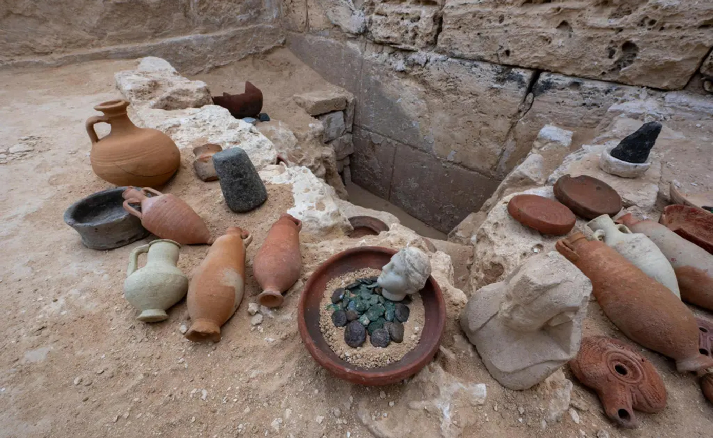 Η ομάδα βρήκε επίσης ένα ημίψηλο άγαλμα ενός βασιλιά που φορούσε την κεφαλόδεσμο Nemes, 337 νομίσματα, πολλά από τα οποία είχαν την εικόνα της βασίλισσας Κλεοπάτρας VII, μαζί με τελετουργικά αγγεία, ασβεστολιθικά δοχεία, χάλκινα αγάλματα, ένα φυλαχτό σκαραβαίου με την επιγραφή «Η δικαιοσύνη του Ρα ανέτειλε» και μια σειρά από άλλα αντικείμενα.