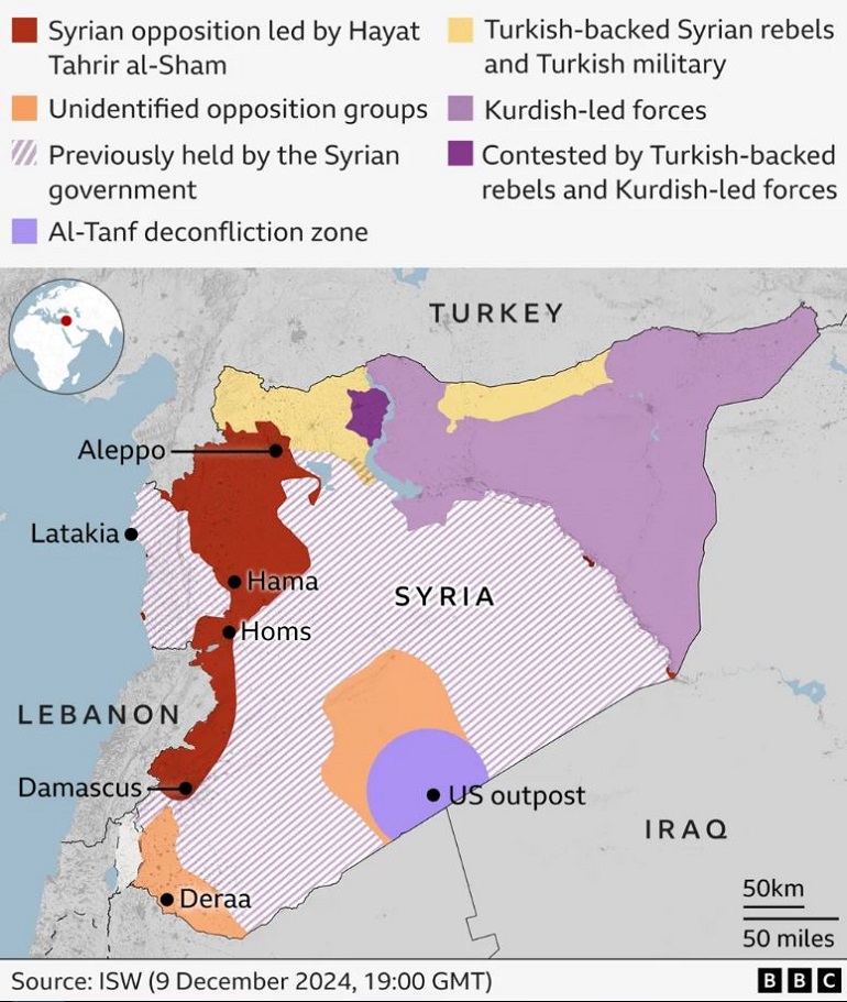 Η πτώση του καθεστώτος Άσαντ οφείλεται στην απροσδόκητη και ραγδαία προέλαση των ανταρτών HTS, όμως, αν και η οργάνωση ελέγχει τις βασικές πόλεις της Συρίας, δεν κυβερνά όλη τη χώρα. Η Συρία, εδώ και χρόνια, είναι υπό τον έλεγχο μιας σειράς από αντάρτικες ομάδες, όπως οι HTS στην Ιντλίμπ και οι κουρδικές δυνάμεις στη βόρεια και βορειοανατολική Συρία, οι οποίες έχουν καταλάβει εδάφη και τις τελευταίες ημέρες και εβδομάδες.