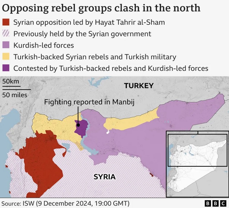 Σύμφωνα με το BBC, στη βόρεια πόλη Μανμπίτ σημειώνονται συγκρούσεις μεταξύ των δυνάμεων που υποστηρίζονται από την Τουρκία και των κούρδων ανταρτών. Και οι δύο πλευρές ισχυρίζονται ότι κατέχουν μέρη της πόλης και οι μάχες συνεχίζονται σε ορισμένες συνοικίες.
