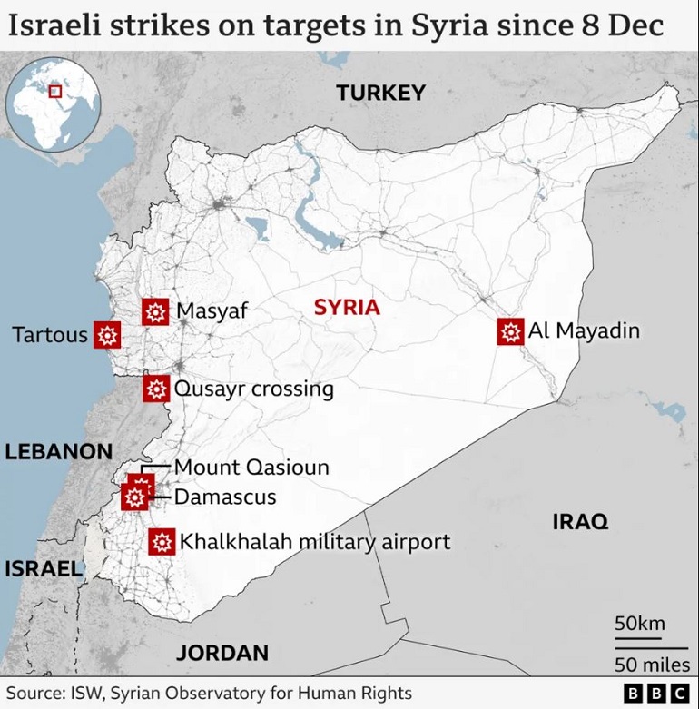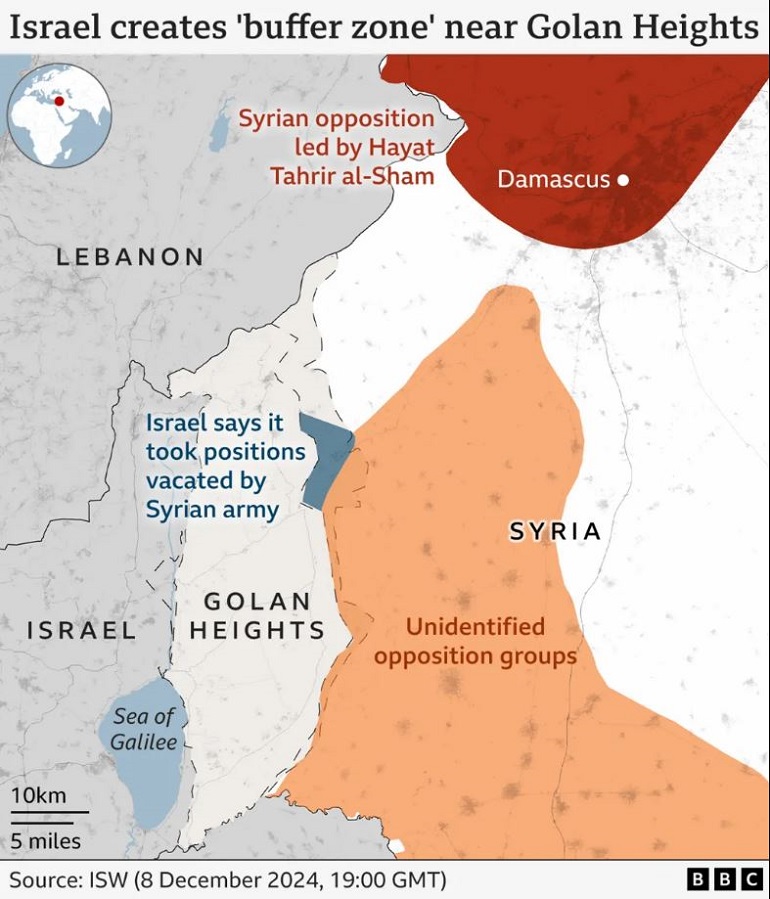Το Ισραήλ ανακοίνωσε, επίσης, ότι κατέλαβε προσωρινά μια αποστρατικωποιημένη ζώνη στα Υψώματα του Γκολάν, δηλώνοντας ότι η συμφωνία απομάκρυνσης του 1974 με τη Συρία είχε «καταρρεύσει» με την κατάληψη της χώρας από τους αντάρτες.